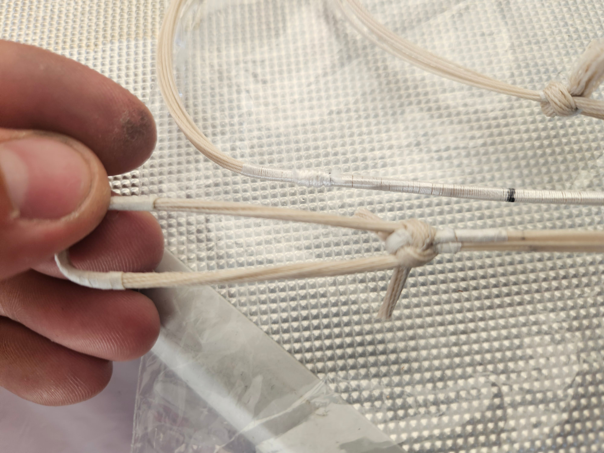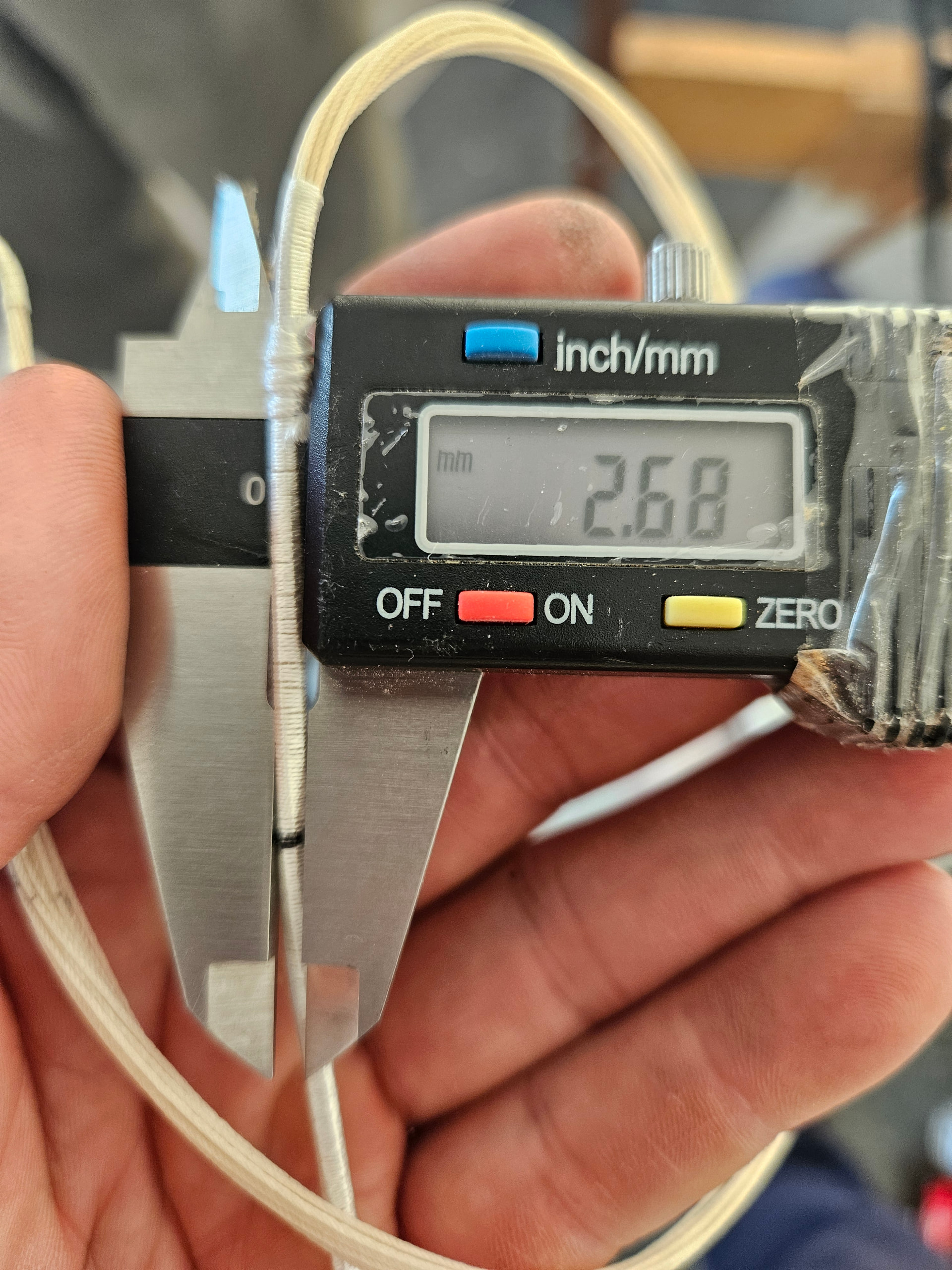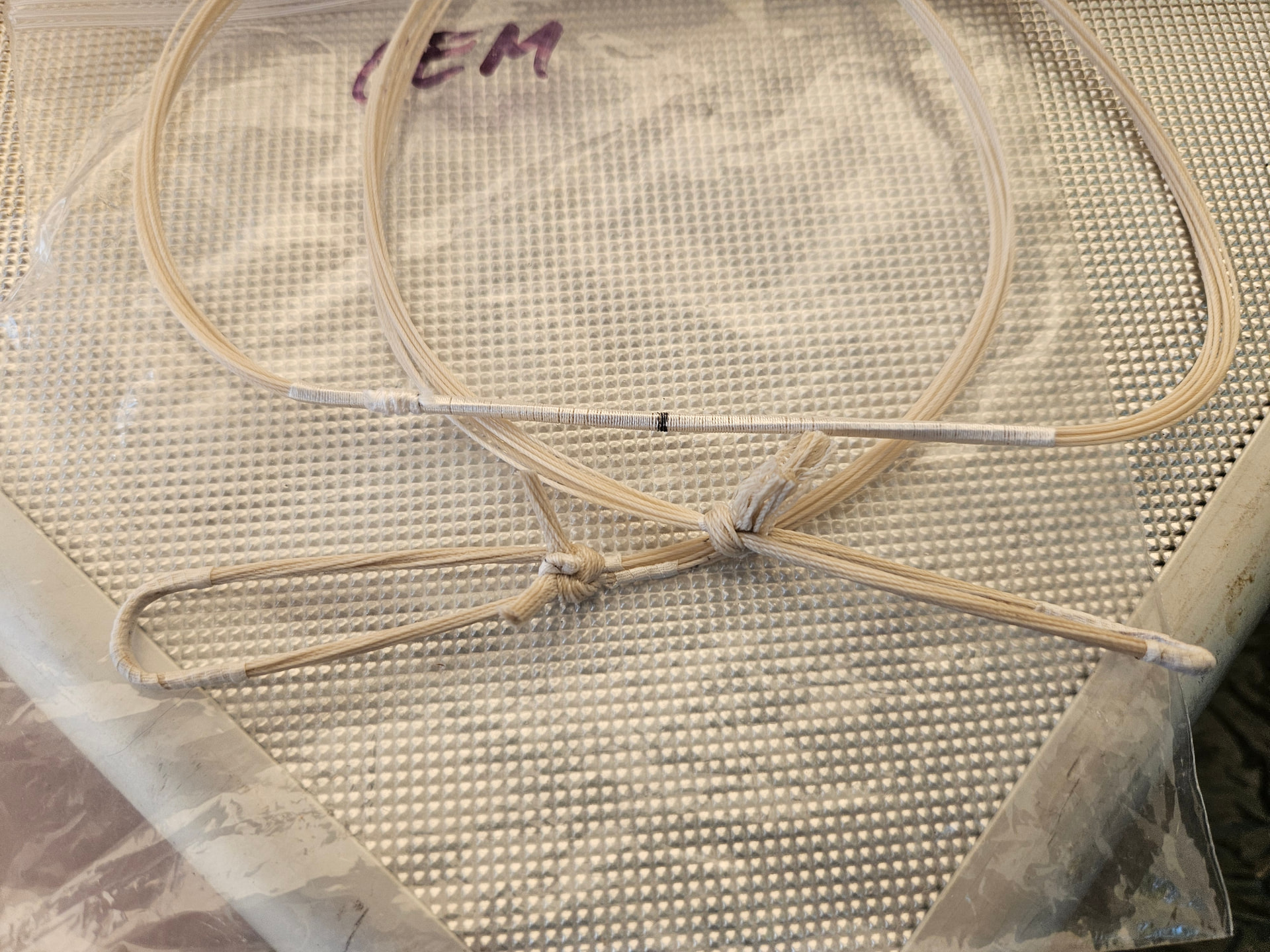 Tästä on pitänyt laittaa kuvia. Mittailin ja kuvailin jännettä Istanbulissa viime kesällä. Jänne on liotettu 15% liimaseoksessa. Kestää Adamin mukaan 100# jousella ampumisen. En muista enää enkä nää kuvista tarkkaan, mutta ihan kuin jännelenkeissä olisi teippiä? Kummallista.