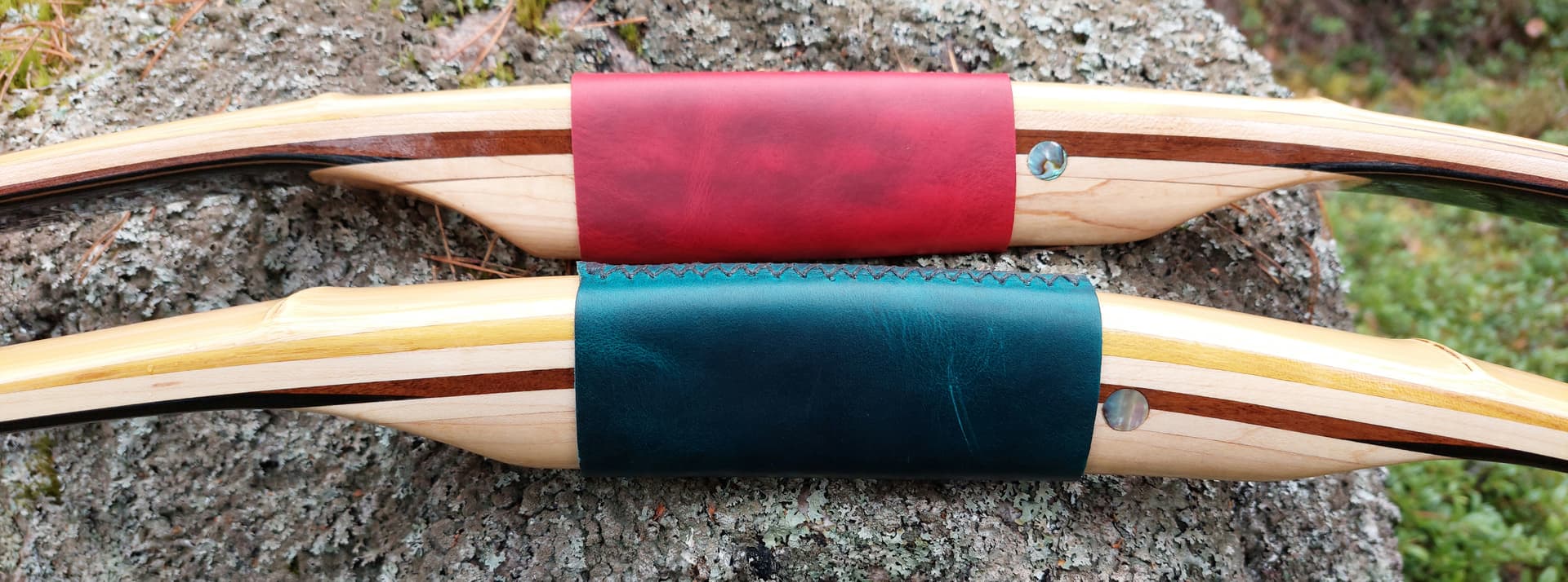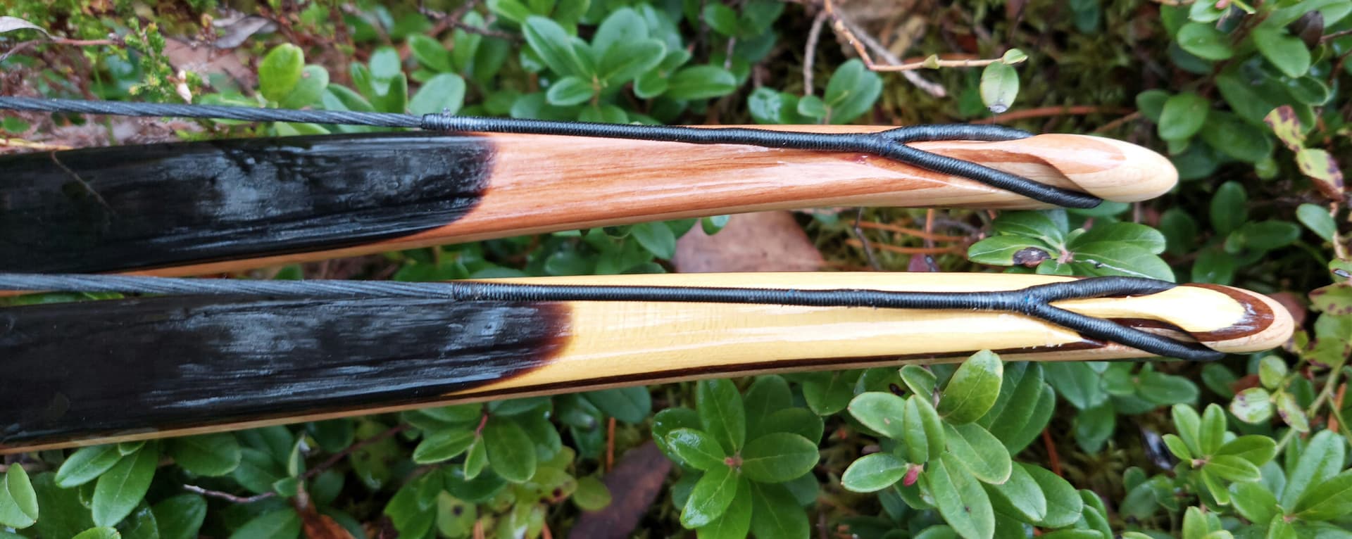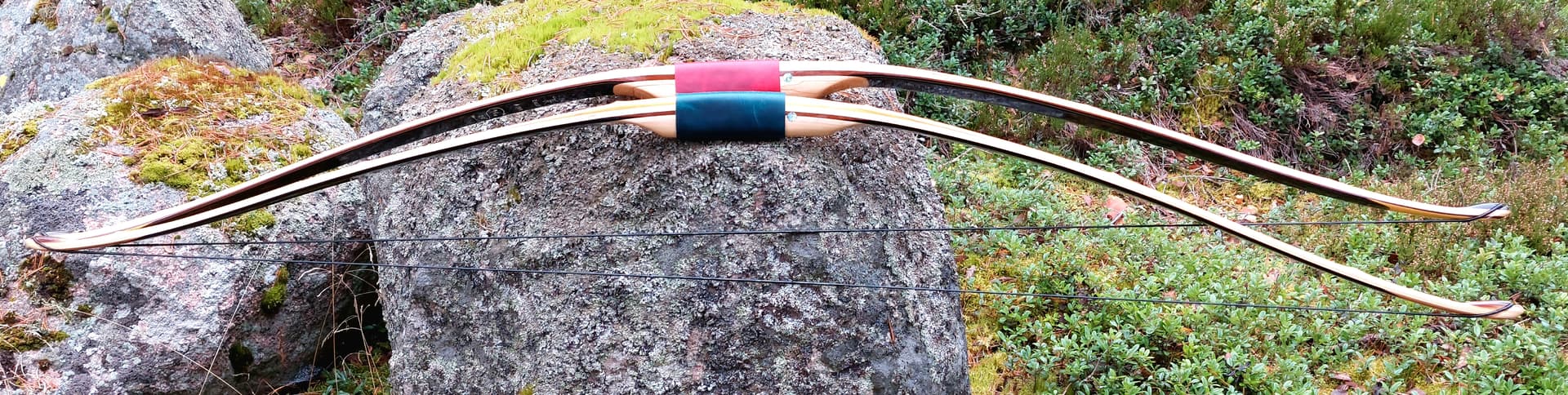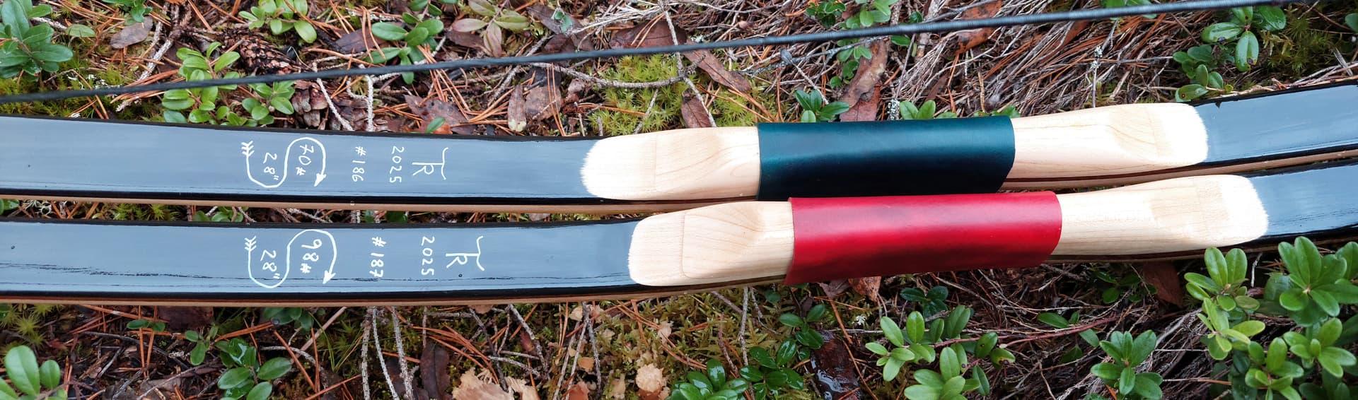 Pari kuvaa valmiista jousista. Tosiaan moso-bambuselkä, vaahteraydin (jäykemmässä lisäksi ohut säle ipeä) ja sarvivatsa. Vatsasäle on tehty ensin viidestä osasta – keskellä noin 200 mm ipeä, sen jälkeen molemmin puolin 600 mm sarvea ja kärjissä noin 100 mm kiiltotuomea ja jäykemmässä osagea. Nämä osat liitetty toisiinsa viistoliitoksilla. Näin käytössä oli yhtenevä vatsasäle, jonka ohensin kärkiä kohti 0,002 mm/m, myös ydin on ohennettu, 0,004 mm/m. Kahvassa vaahteraa, nokeissa vesipuhvelin sarvea, iskulevy helmiäistä ja kahva kasviparkittua nahkaa. Pintakäsittelynä luonnonöljypohjainen venelakka. Punakahvainen on 98-paunainen ja vihreäkahvainen on 70-paunainen. Vapaassa koekäytössä XV Taka-Hikiän Mestaruus 2025 -kilpailussa!