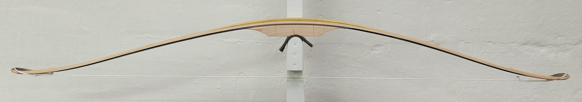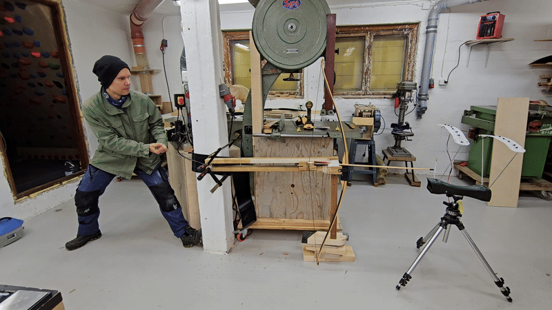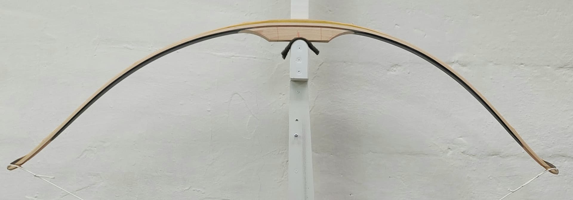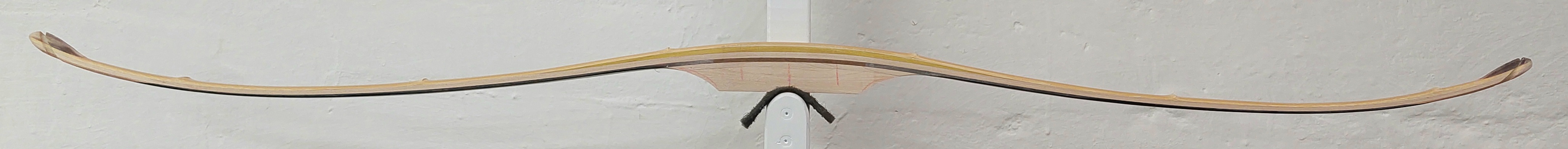 Tämä ei ole vielä lainkaan valmis jousi, vasta kavennettu ja kulmat pyöristetty, eikä tilleröintiä ole vielä tehty; tässä on siis tilleri sisäänrakennettu ohentamalla laminaatit valmiiksi ennen liimausta. Silti tilleri oli sen verran hyvin kohdillaan, että vedin suoraan täyteen vetoon.