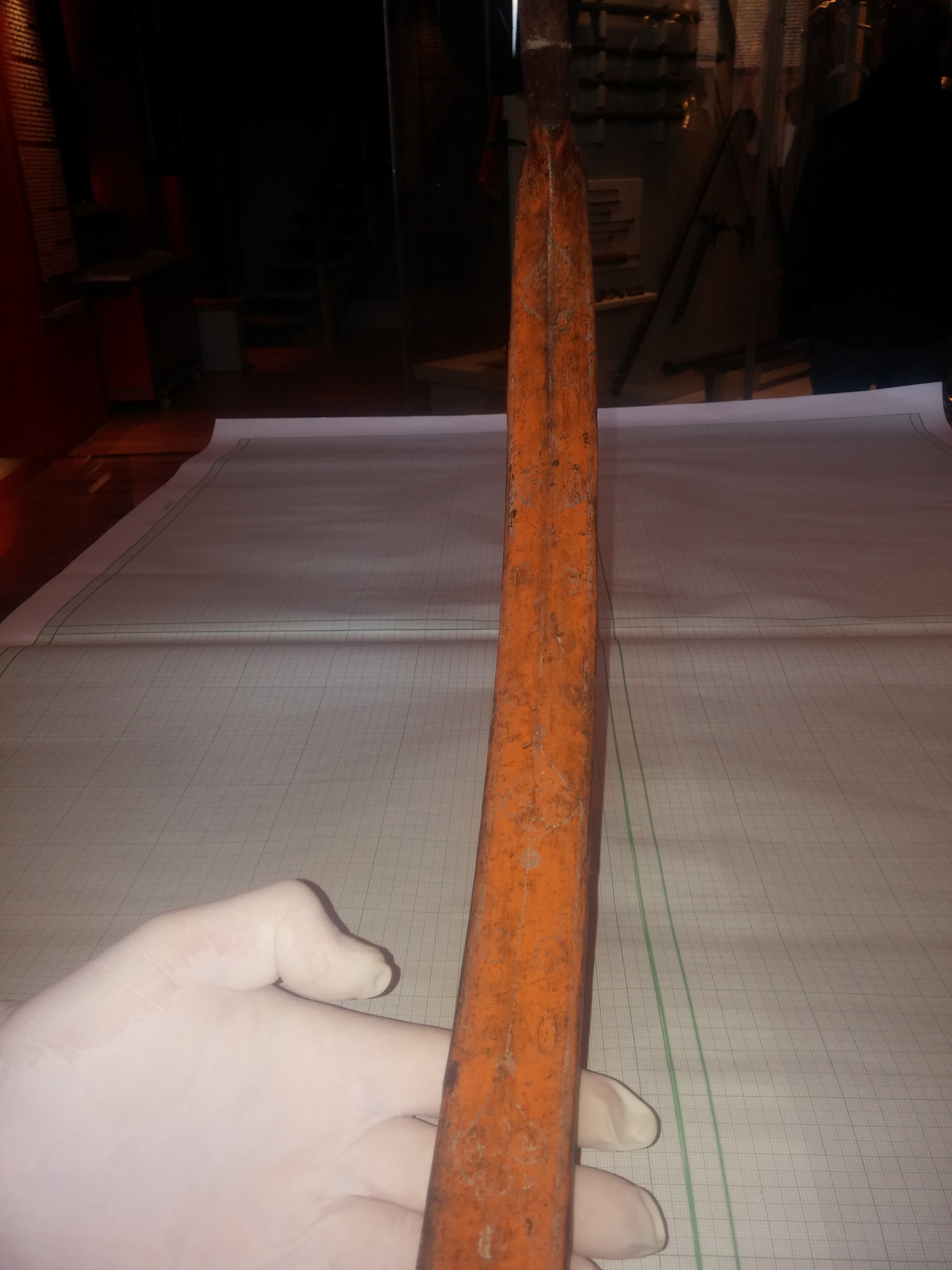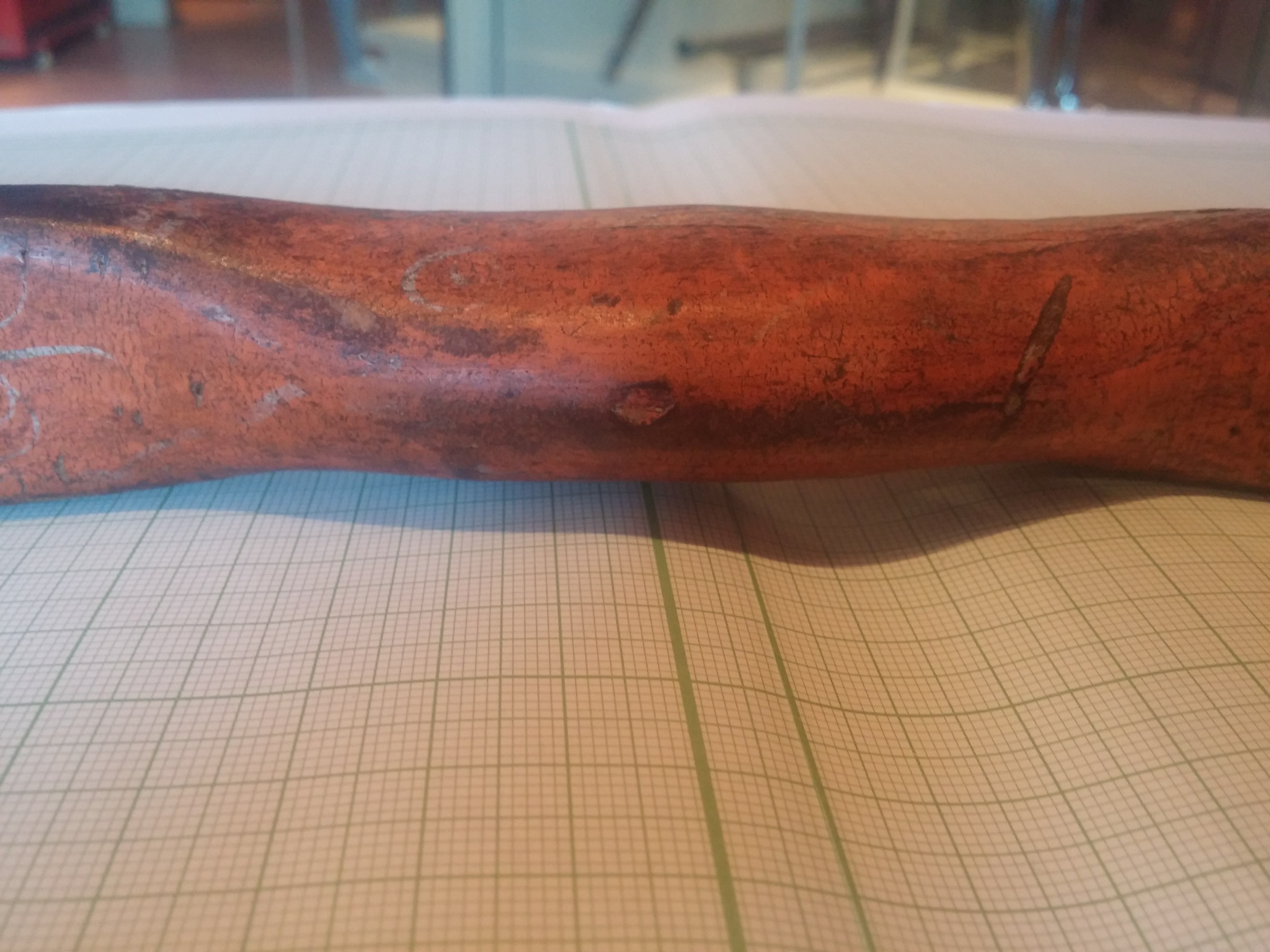 Vaikuttaa omaan silmää ihan tavalliselta ajan patinalta josta jäyttö on kulunut alkuperäisen maalin pois. Jälki on rujo mutta ei tuossa kohtaa mitään hinkkaamista tule vaiin isku ja iskun punos kohta on vahvistettu niin punoksilla kun nahalla. Itse en näy mitään muuta syytä sileään pintan kuin estetiikka.