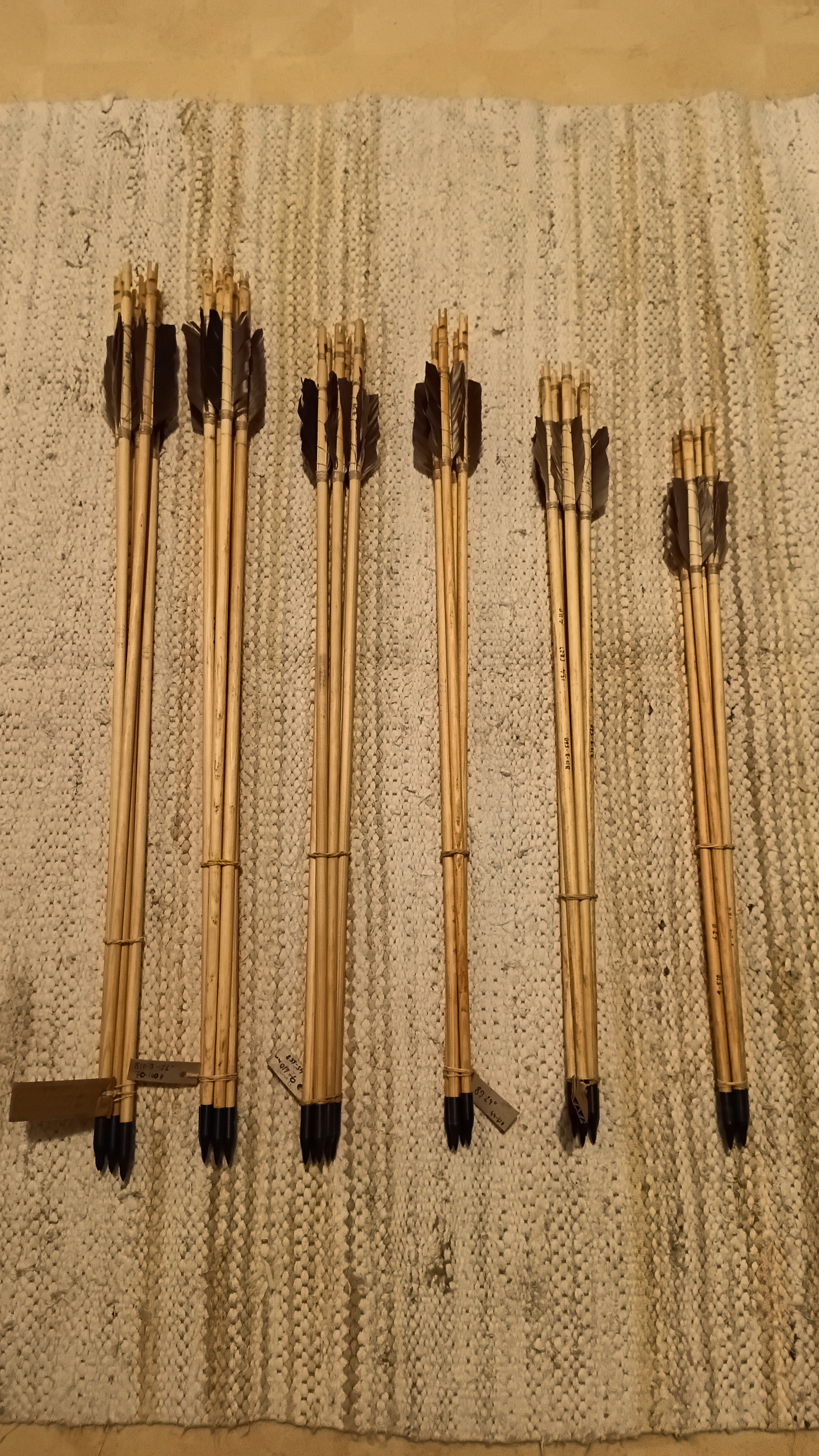 Testasin sokkona alla olevia nuolisettejä. Testijousena tammi 37# 19”, sama josta olen tehnyt videon. Ampumaetäisyys n. 2 m. Pyrin ampumaan suoraan, khatraa välttäen. Kriteereinä pidin sitä, että nuoli iskeytyy suoraan maaliin eikä kylki edellä, ja sitä kuinka paljon se kolisee jousen kylkeen laukaisussa, ja yleisen vaikutelman mukaan.