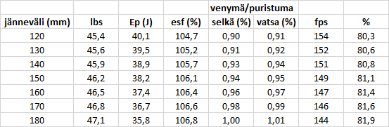 Ep (J) on jousen varastoima energia jouleissa ja se nousee kun jänneväliä madalletaan. Esf (energy storage factor VirtualBow:ssa) kuvaa vain voimakäyrän muotoa – isommalla jännevälillä jousessa on tavallaan enemmän esijännitystä, jolloin voimakäyrä on alussa aavistuksen pulleampi. Ja hyötysuhde kasvaa, koska lapojen liikkuvat massat liikkuvat lyhyemmän matkan → vähemmän häviöenergiaa, sekä myös siksi, että jousi varastoi selvästi vähemmän energiaa. Tässä on myös olennaista se, että nuolen massa on vakio 10 graania per pauna, eli kasvaa jousen jäykkyyden kasvaessa. Voisi kokeilla myös vakiomassaisella nuolella, jolloin nopeusero on pienempi. Tosin tärkeintä oli rasitusten kasvu.
