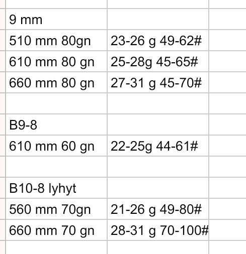 Tavoitteena hakea jouselle sopiva nuoli. 10 graania jousen paunoja kohden on jossain vilahtanut ja niille main se lyhykäisyydessään menee testien perusteella. Mikä sitten on sopiva jäykkyys ja nuolen pituus? 10 gn/# kriteerillä voi tehdä erittäin paksun ja lyhyen tai pitkän ja ohuen nuolen. Materiaalina olen testannut vain mäntyä.