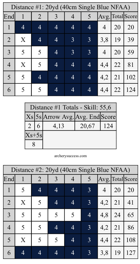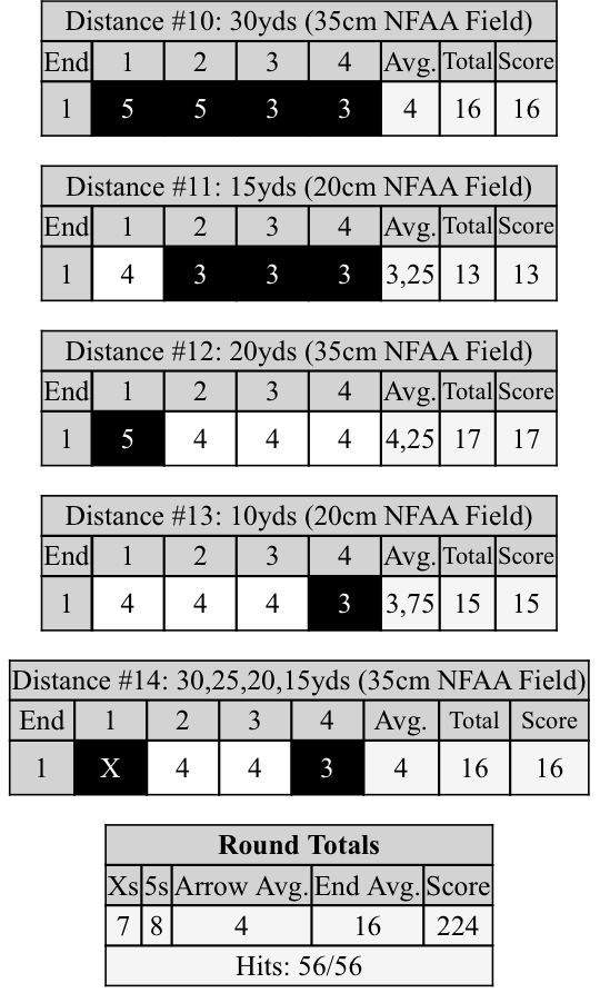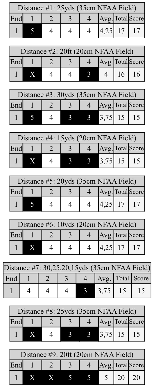 Laitanpa tännekin toisessa ketjussa julkaisemani eilisen tuloskortin: 120 + 131 = 251. Tässä siis testasin 100 gr kärkisiä nuolia vs. tavanomaiset 125 gr kärkiset.