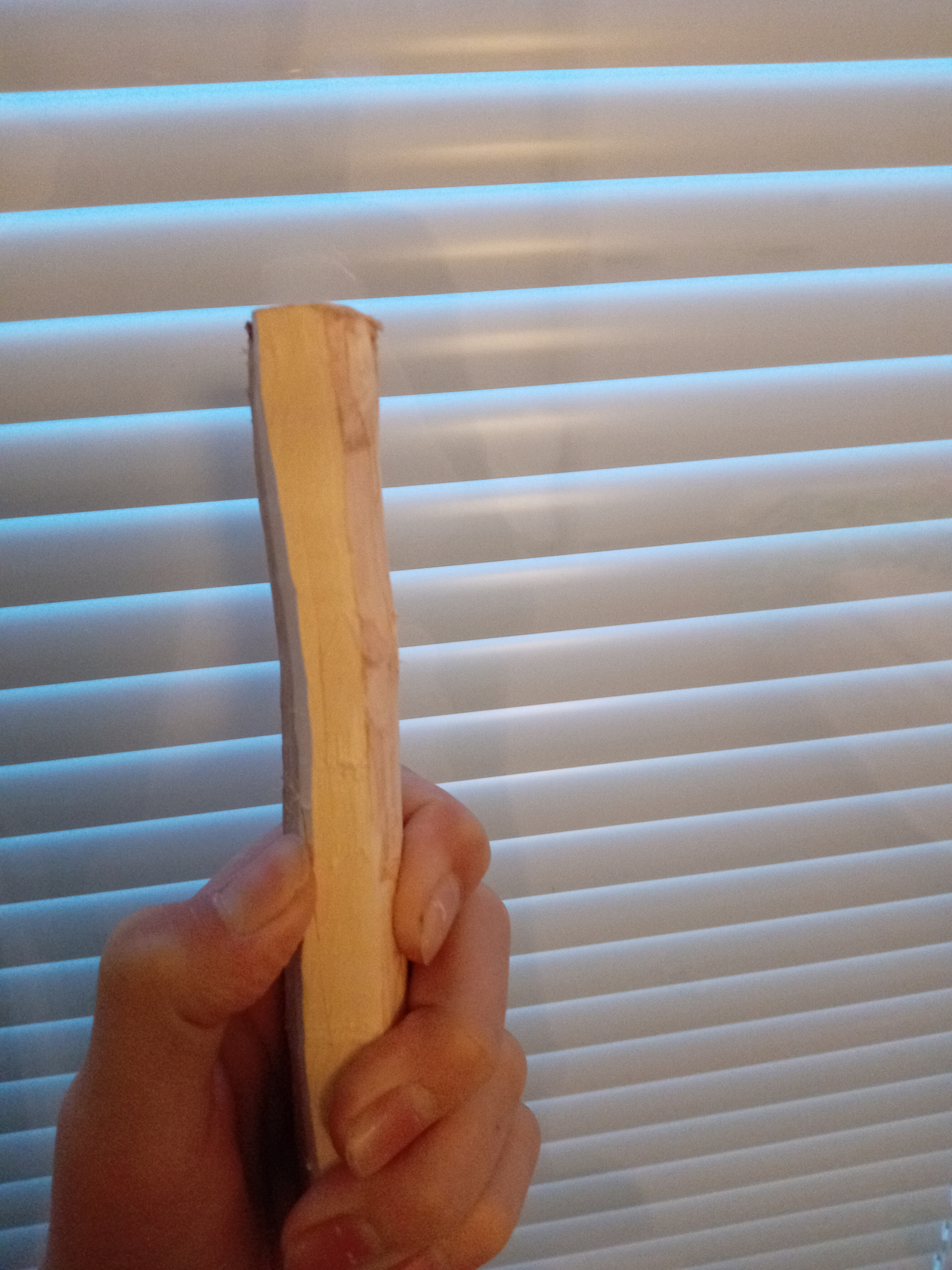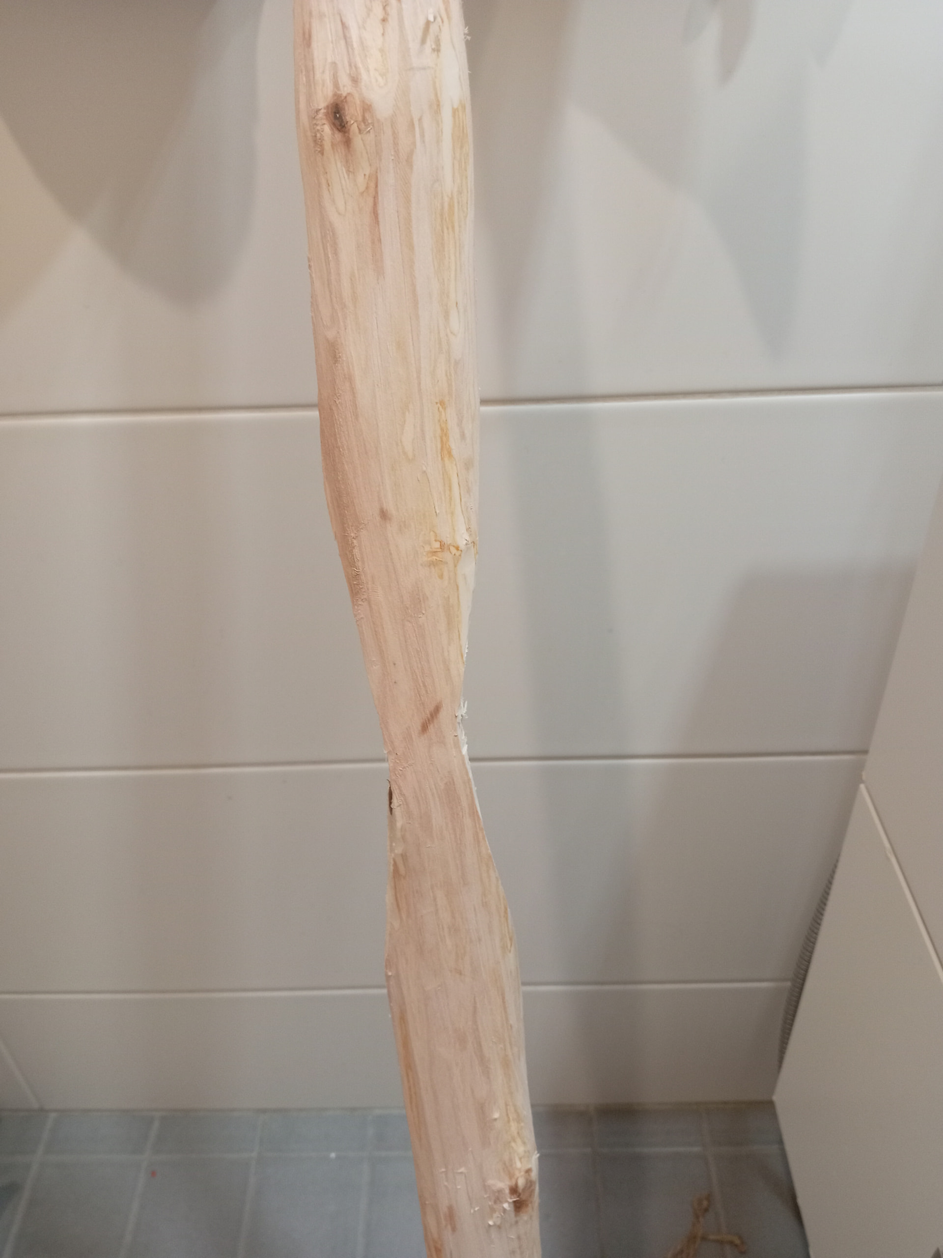 Kuori hellävaroen esim tylsällä vetopuukolla. Tuoreena irtoaa paremmin. Veistä karkeaan muotoon, jätä lapa esim 2,5 cm paksuksi. Huoneenlämmössä talvella kuivuu 3-4 vkossa. Kun aihiosta putoaa painoa alle 1 gramma päivässä, on aihio varmasti kuivunut.