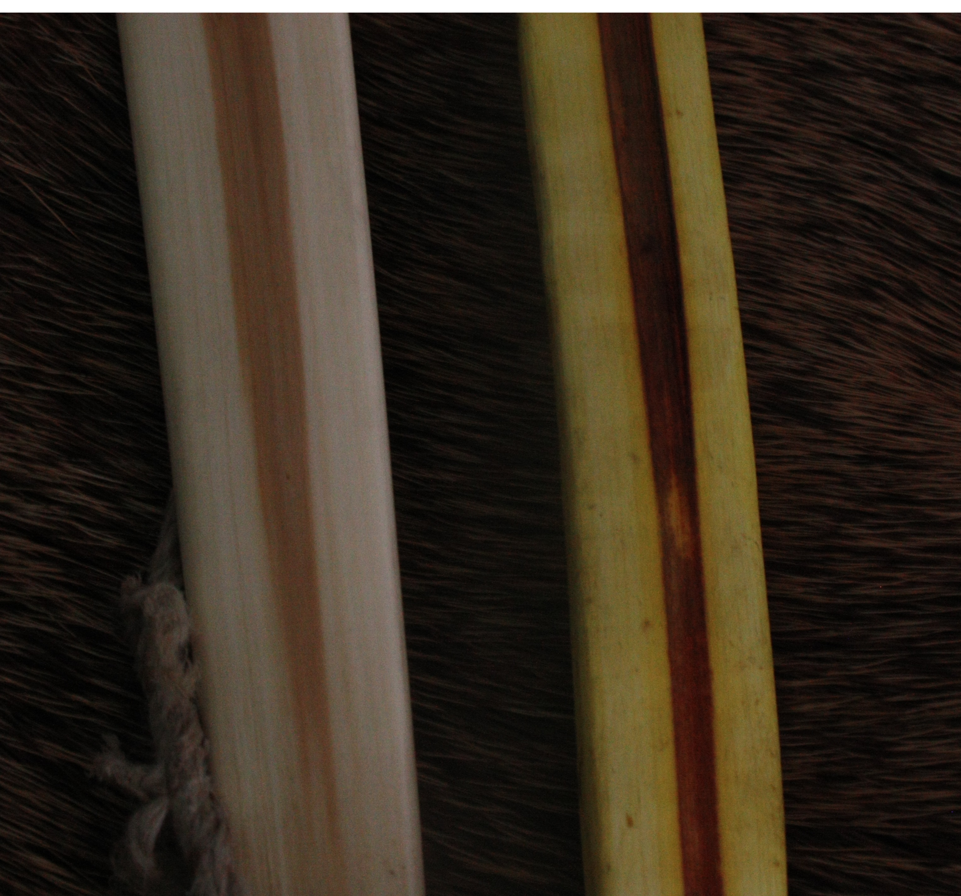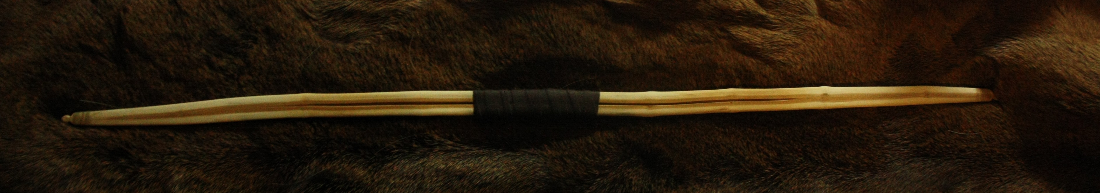 Tällainen vähän yli viikko sitten kipattu ja nopeasti kuivattu kuusamajousi. Pituutta 102 cm, tasaleveä 26 mm, paitsi kärjissä 14 mm. Paksuutta kahvassa ~ 17 mm, keskikaaressa 13 mm ja kärjissä 9 mm. Painoa 210 g, selässä ihan ohut kerros jännettä. Vetää suunnilleen 40 paunaa 19 tuuman vedolla. Alalapa (tyvipää, kuvissa vasemmalla) oli helpompi, ylälavan kanssa sai hetken vääntää neljän oksan ja kahvan jälkeisen loivan myötäkäyrän takia. Aika hyvä siitä kuitenkin tuli. Refleksiä oli jonkin verran, jänteeltä irrottaessa joitain millejä, levättyään hiipii takaisin melkein 30 milliin (kuvassa heti jänteeltä irrotettuna). Hienon näköistä ja lujan tuntuista puuta ja voi olla että ohut jännekerros saattaa olla enemmänkin turhaa painoa, varsinkin kun malli on perus D eikä vastakaarevuutta paljoa ole. Taitaa kyllä ainakin toistaiseksi tammijännäri joutaa hyllylle ja tämä viineen!