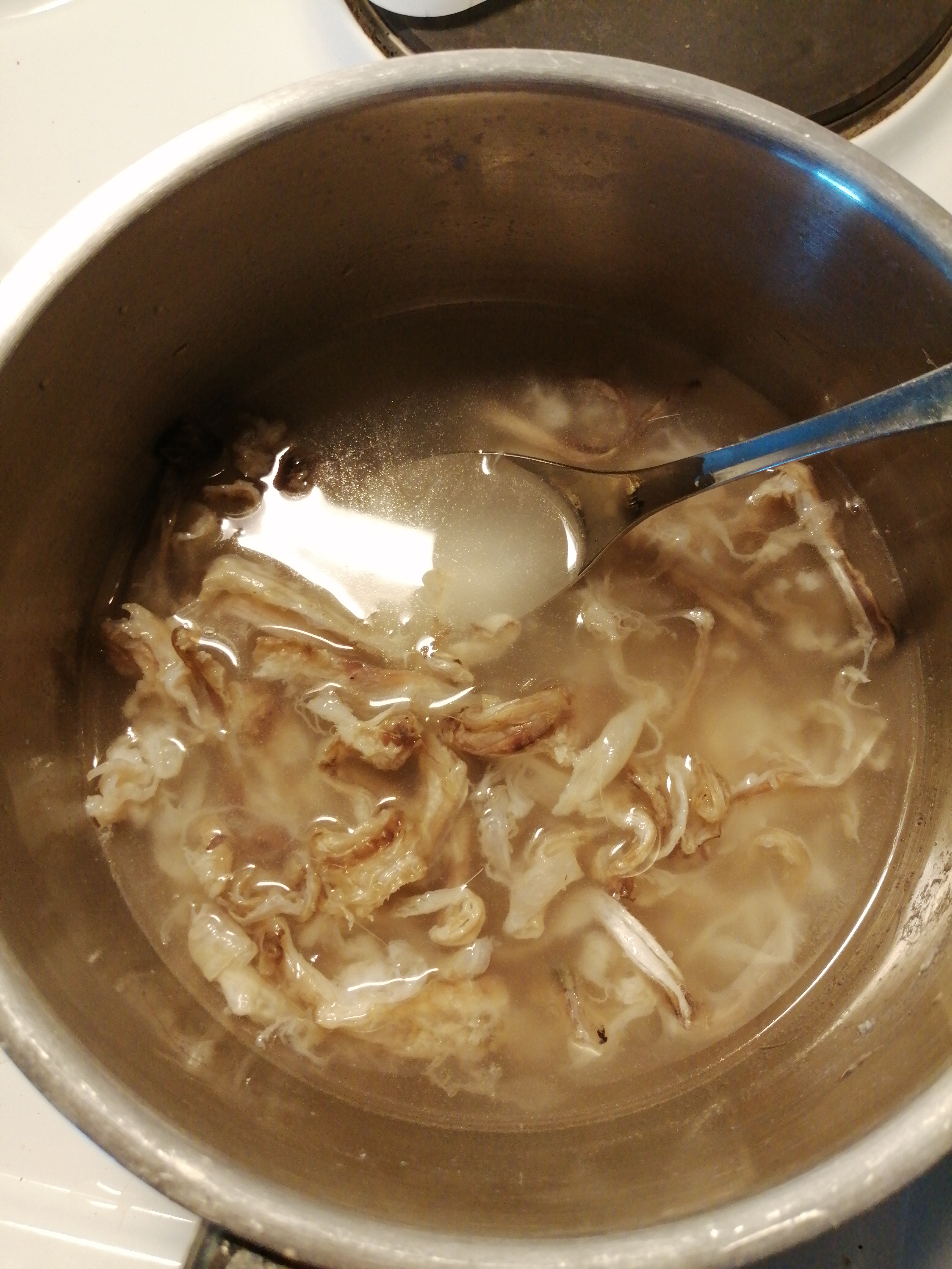 On on. Annan vinkin että kun suurin osa sulaa liimaksi, ota se ensimmäinen satsi eri astiaan kuivamaan liimaksi. Sitten siirrä loput roippeet toiseen kattilaan ja jatka vielä niiden lämmittämistä liimaksi.