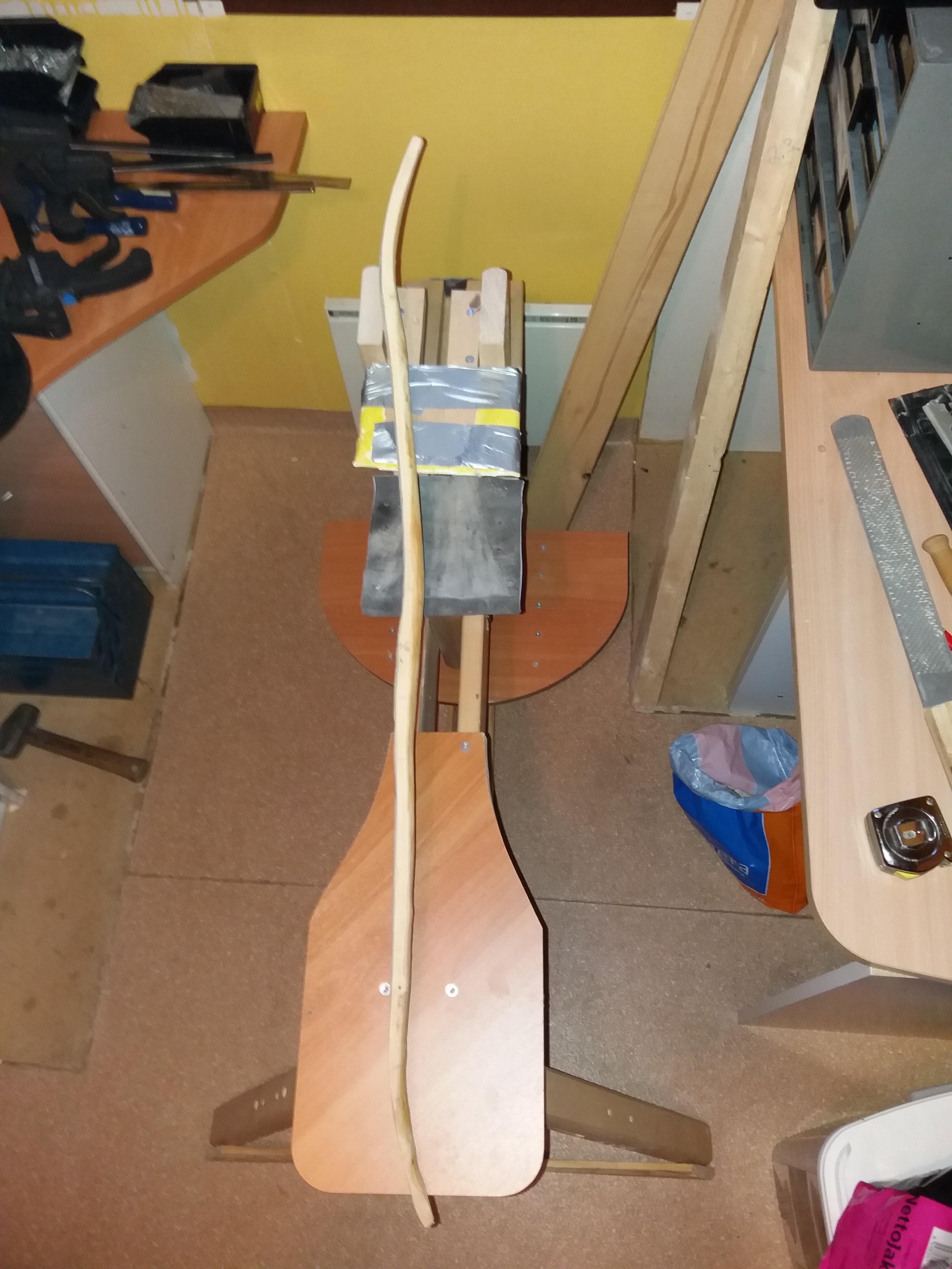 Ja mikäli ymmärsin Tallipojan tulevaisuuden kuvauksen oikein niin tuosta juosestasi on tulossa kapea keppi joka kapenee suoraan kahvasta kärkiin? Tämä muotokaan ei suosi jänne selkää niin hyvin kuin pehmeästi kapenen muoto. sanoisin että levesy tolisi säilytää lähes samana noin 20cm päähän nokkia ja sitten kaventaa kärkiin.