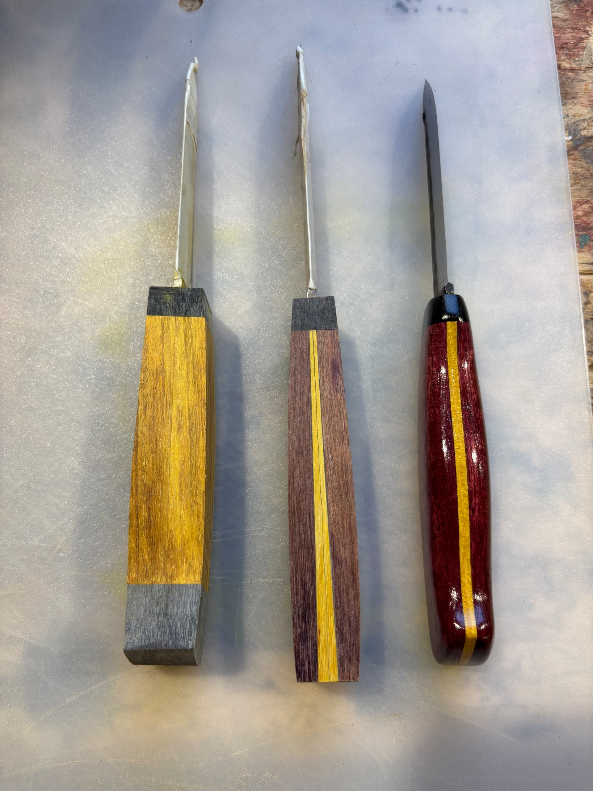 Käsi ja silmä kertoo onnistumisen. Jokunen perinteinen kahva tullut tehtyä. Keskimmäisestä tulee melko perinteinen malli, vasen vähän modernimpi. Sen sarviperä muuten ei ole pelkällä liimalla kiinni. Oikeasta tulee mökkihousujen vyöllä roikkuva työpuukko ja syrjäyttää Marttiinin rosteriterän, jossa melko samanmuotoinen kahva.