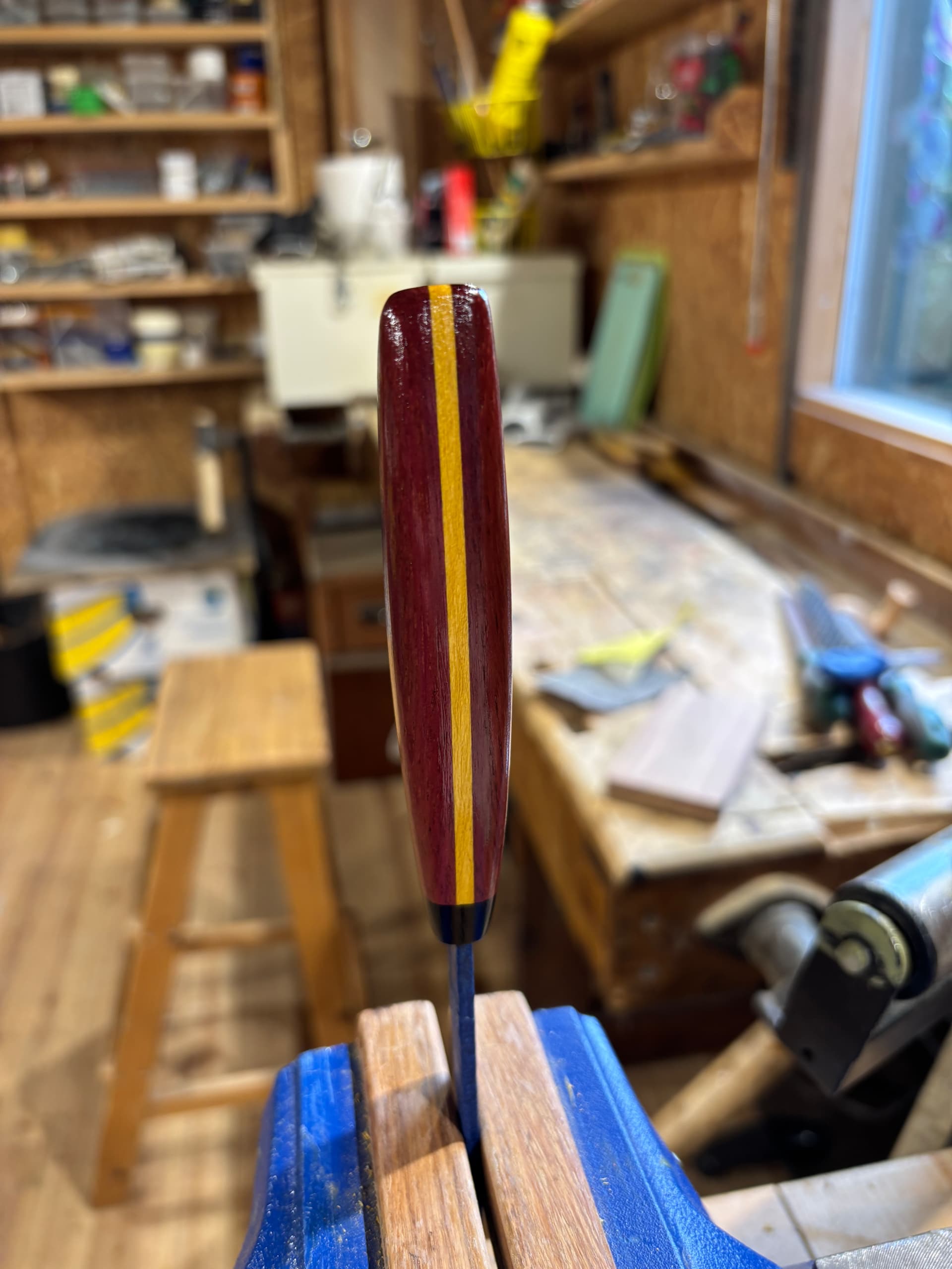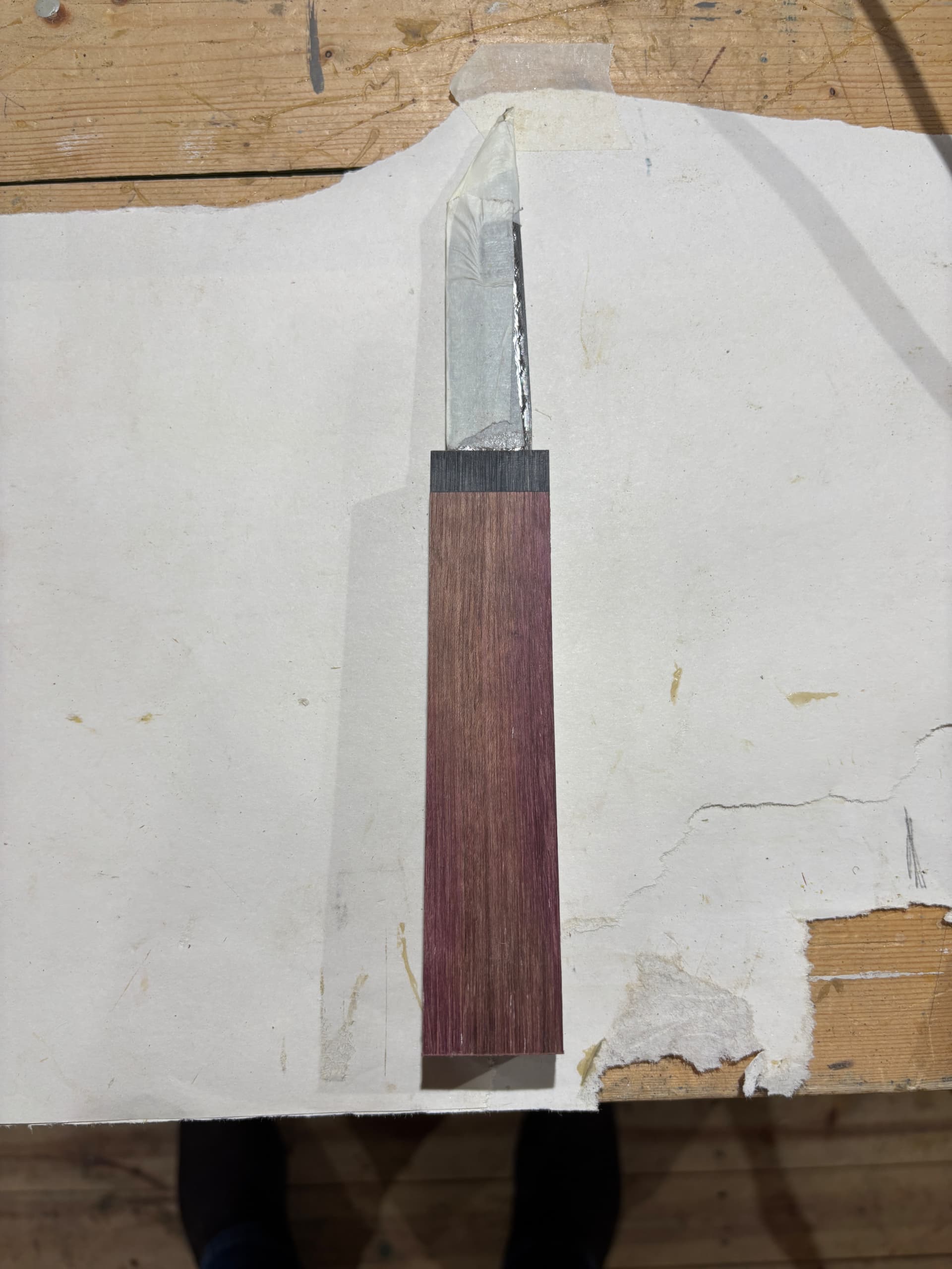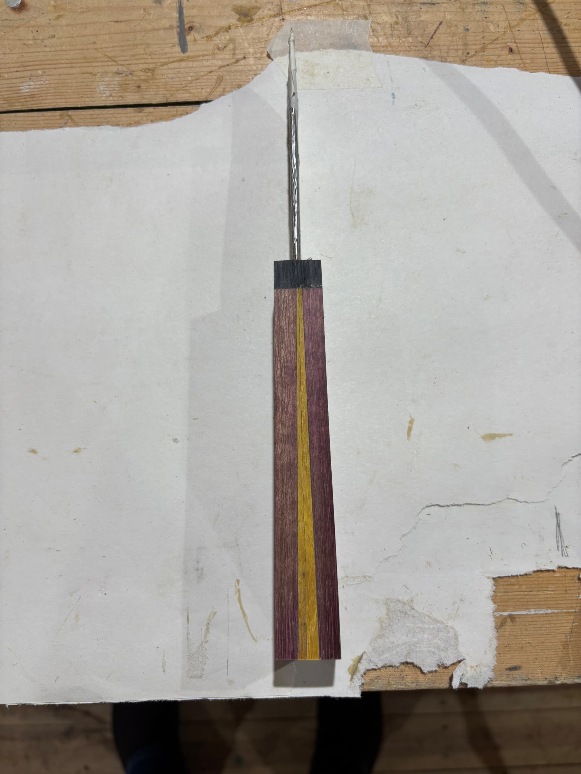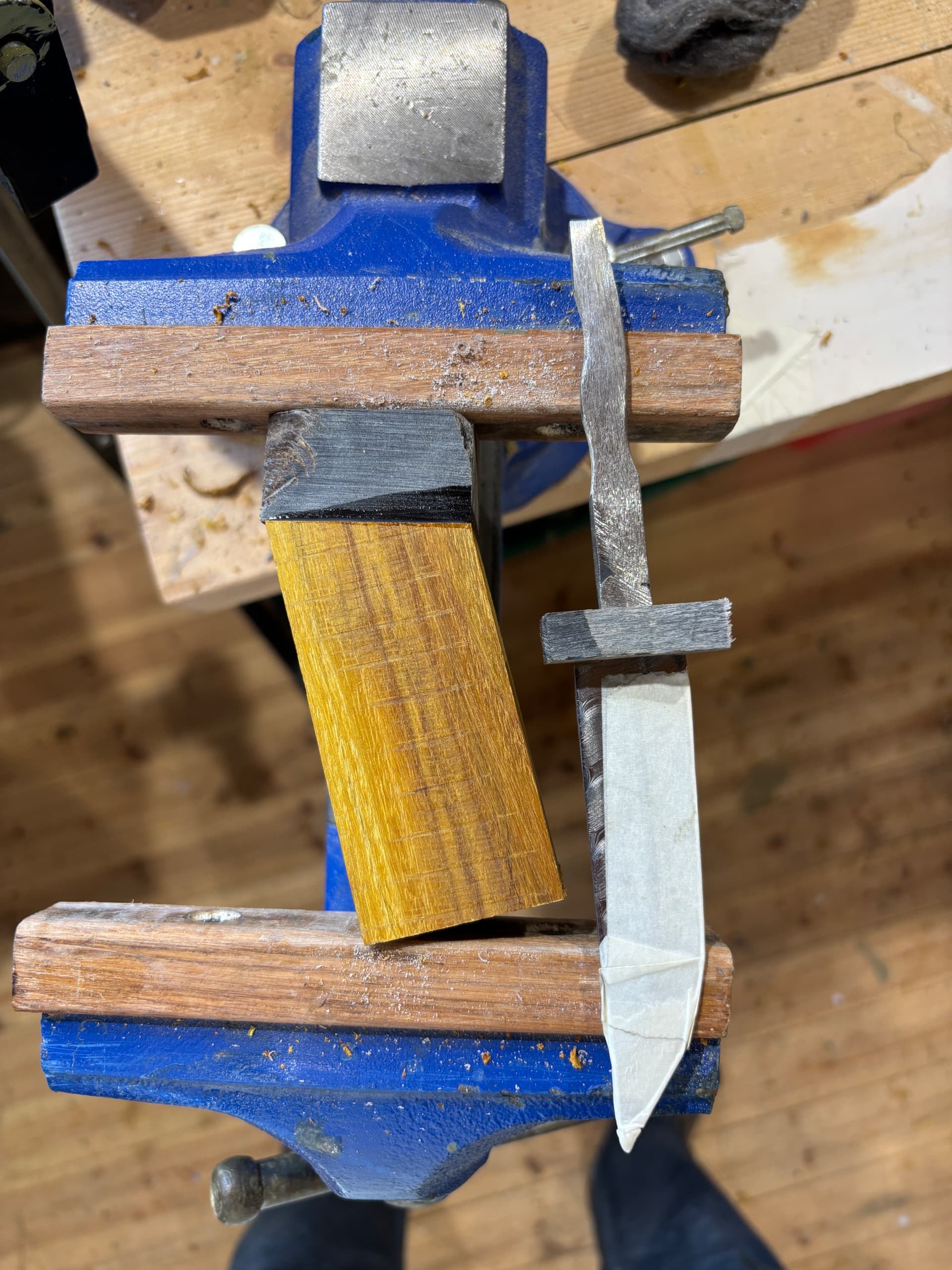Ekan jousinikkarin puukon onnistuttua auttavasti, laitoin damaskusterän hiukan samaan malliin alulle. Seuraavaan damaskusterään tuleekin sitten marjakuusesta kahva.