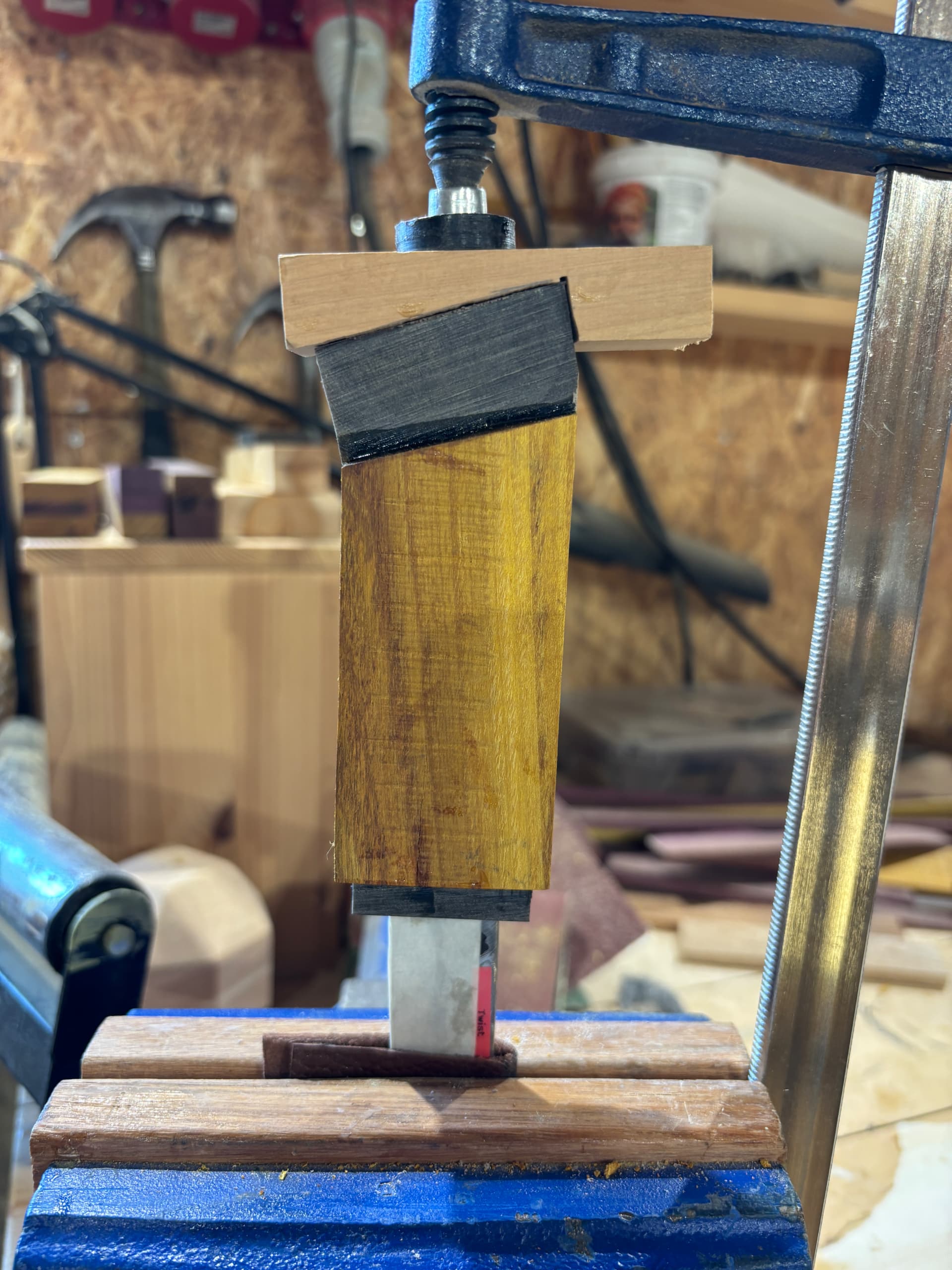 Tällaisen tein, sarvien liimausta varten jousen kiinnitys tukevasti on aina ollut vähän hankalaa, niin ajattelin kokeilla tällaista ratkaisua. Vaikuttaa tukevalta. Estää toivon mukaan myös jousen kiertymistä köyden kiertämisen aikana. Kapulaa piti lyhentää mutta eipä sen tarvi pitkä ollakaan.