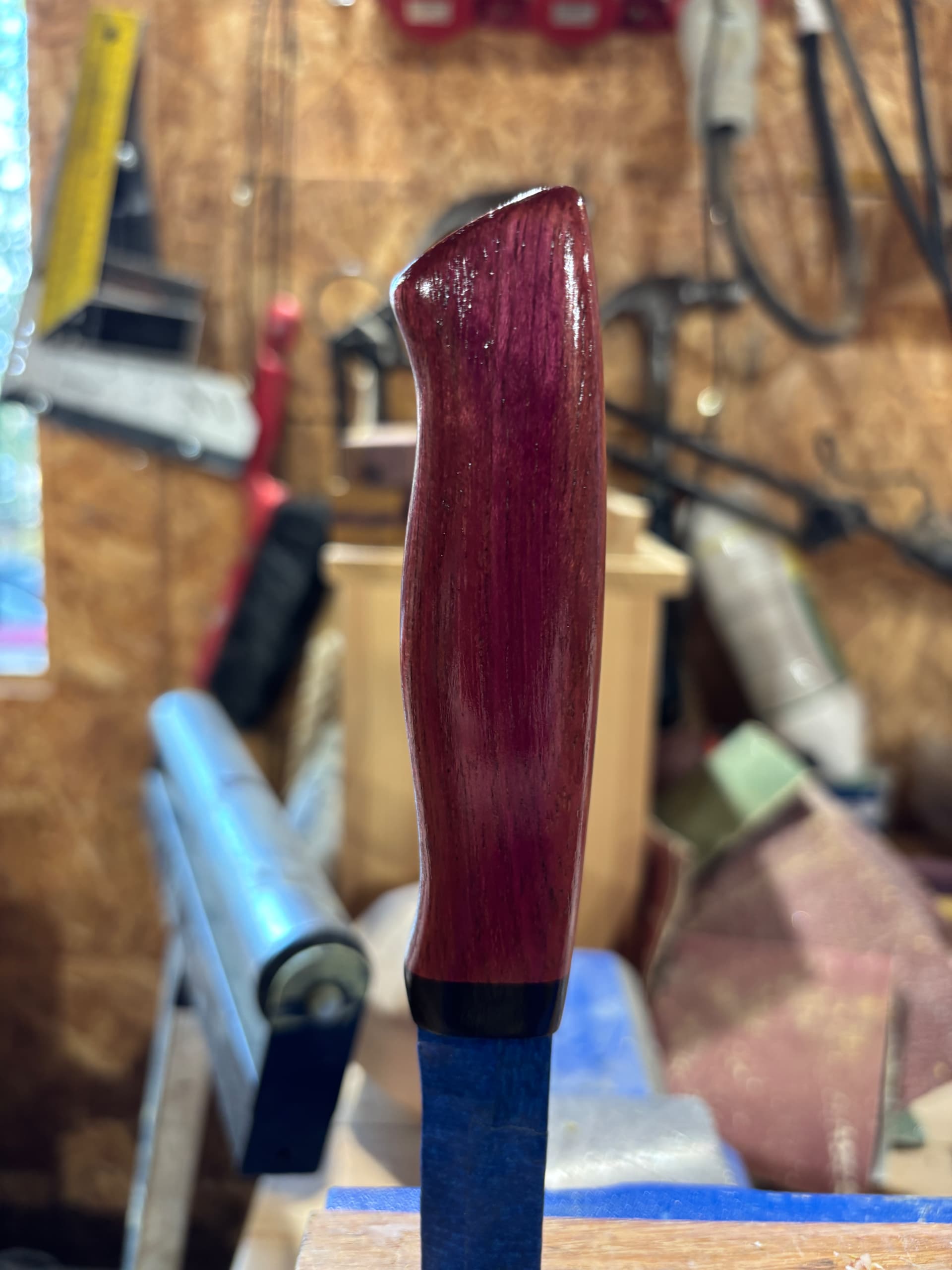 Enpä tehnytkään toiseen damaskusterään marjakuusikahvaa, koska en löytänyt sopivaa palikkaa. Päädyin tuttuun osageen ja heloiksi vesipuhvelin sarvea. Viimeistely sitten tuon edellisen kanssa samalla rupeamalla.