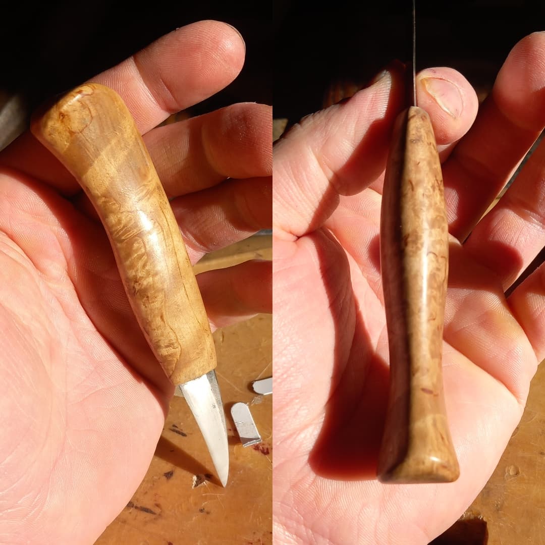 En tiedä kuinka hyvä puukonkahvojen teko sulla on, mutta jos yhtään aikoo uusia muitoja kokeilla nii tee ne vaikka sauna klapeille. Ittelläni oli kouluaikoina kymmenia koivu ja kataja kahvoja eri muotoihin muotuoiltuna kun omaan käteen etsiskelin sopivaa.