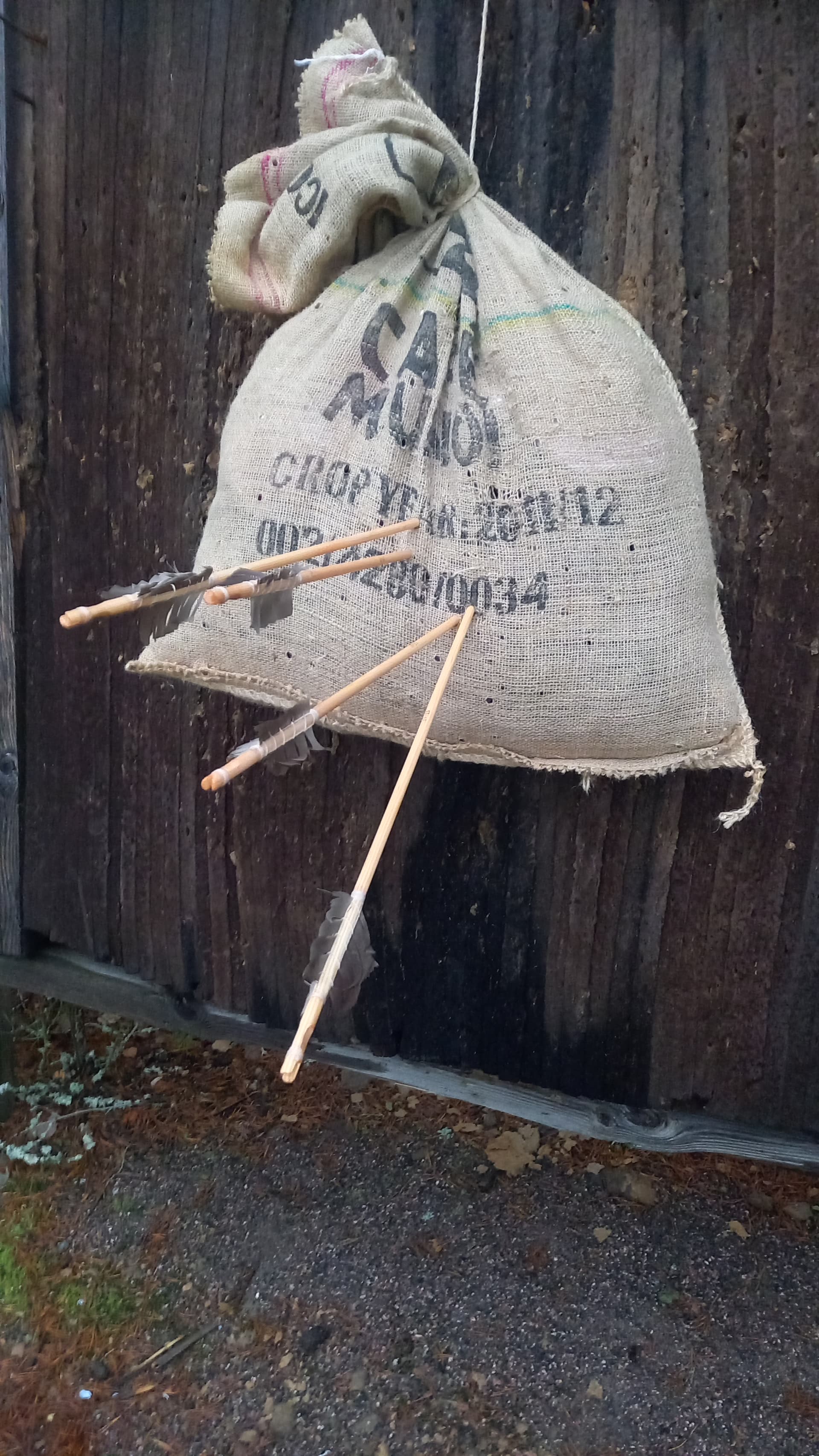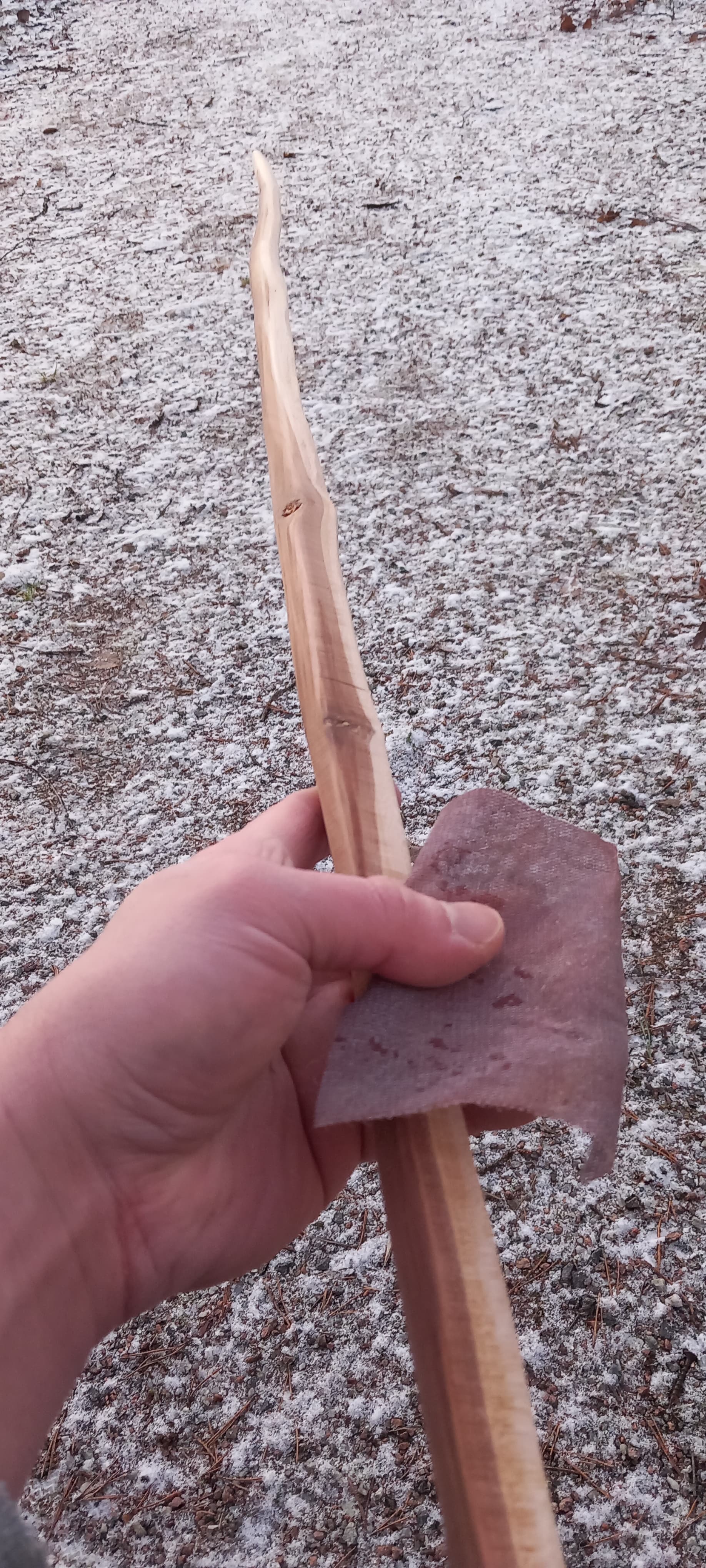 Ei yhtään. Sain melkein täyteen vetoon, ehkä 30#18", 120 cm oli pituutta. Keräsin oksan kesällä kaadetusta pihdasta kaverin pihalta, oli pihkainen pihta. Joku öljy siinä oli pinnassa kun olin tehny siitä aiemmin 147 cm pitkän jousen mutta paksuudesta huolimatta hyvin löysä.
