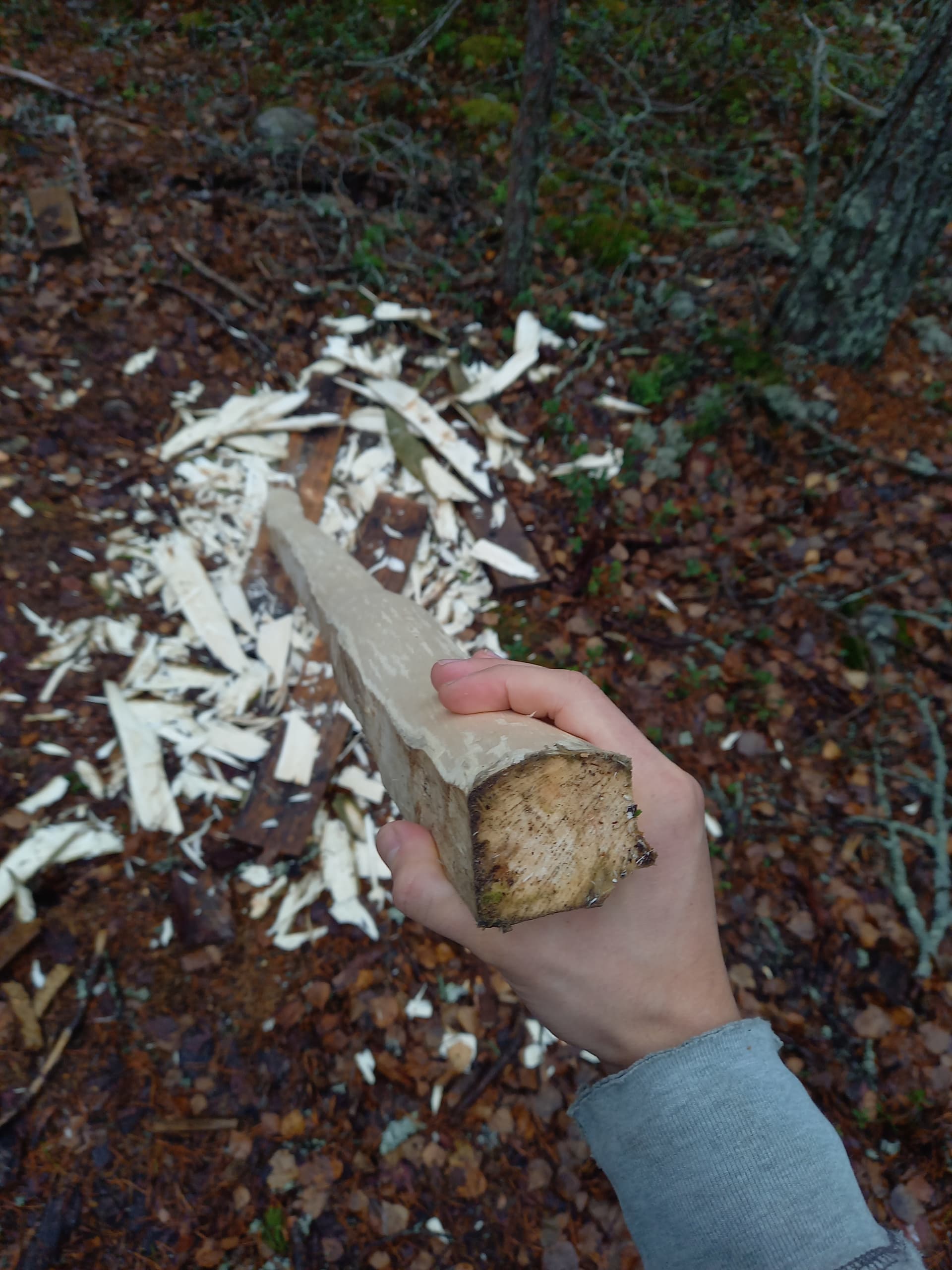 Mökin rannasta kaadettu haapa. Oksaton, jopa 5 cm leveyttä voisi saada lapaan, 180 cm. Kuivumaan ja sit testaamaan, saako jousen.