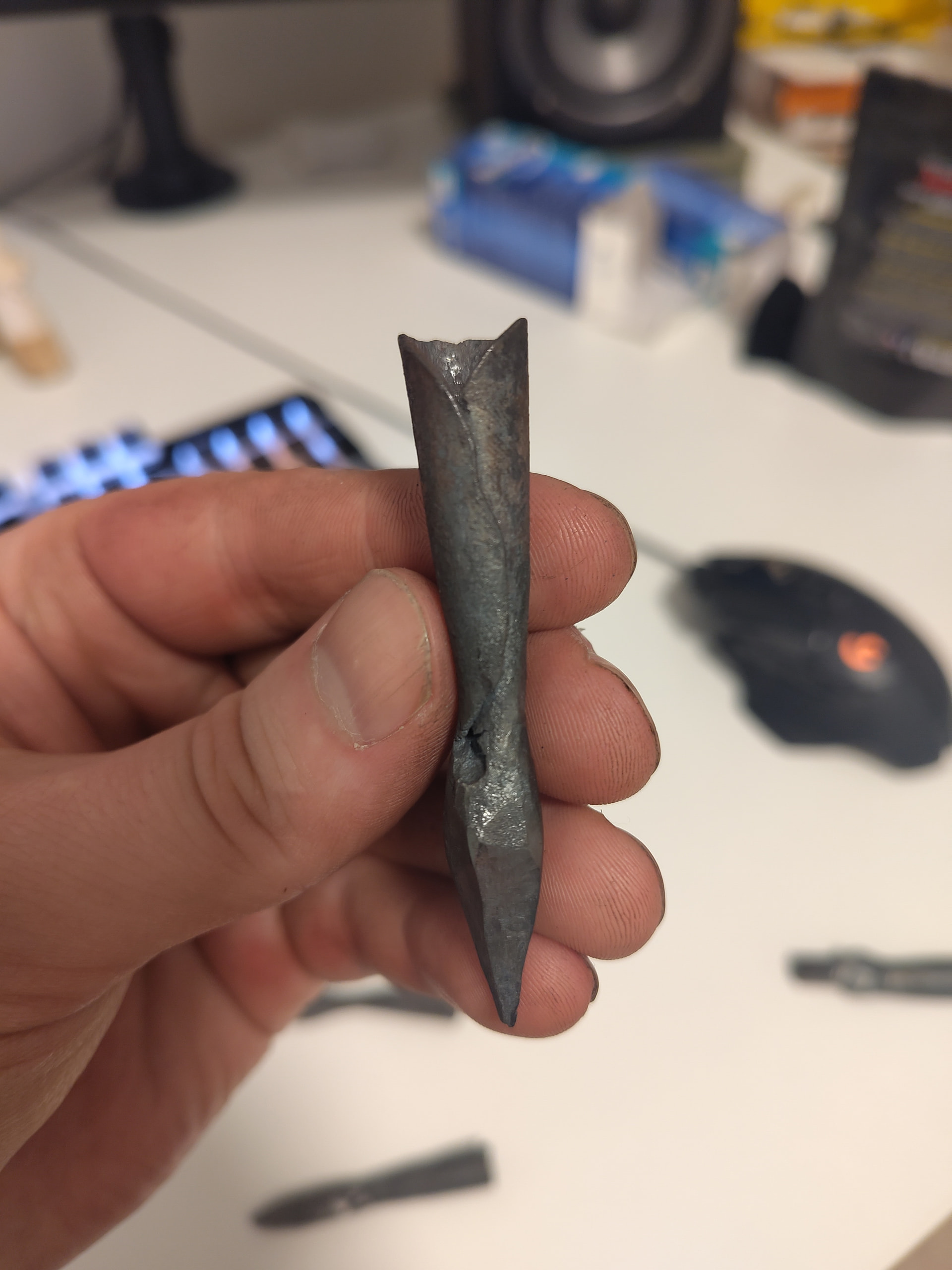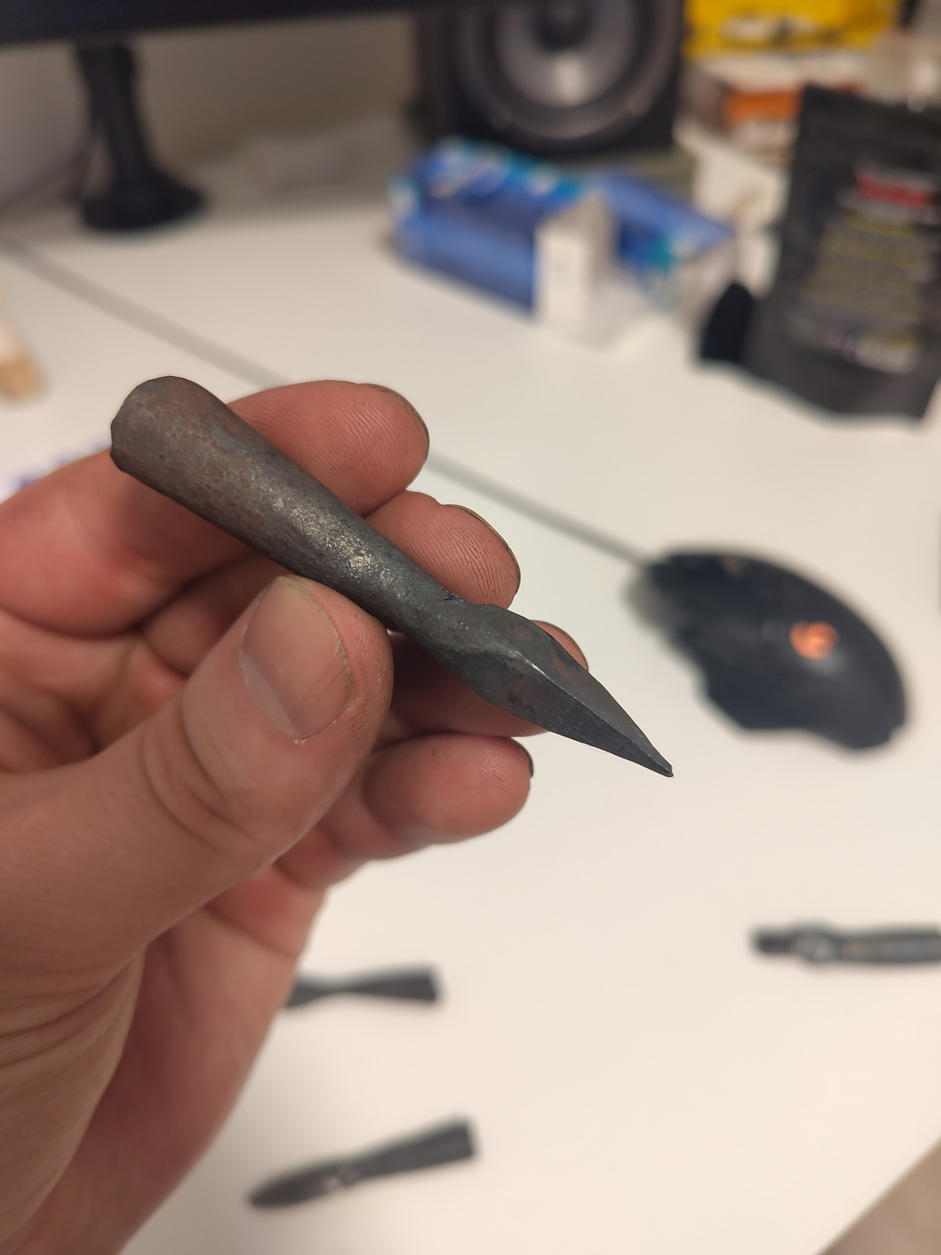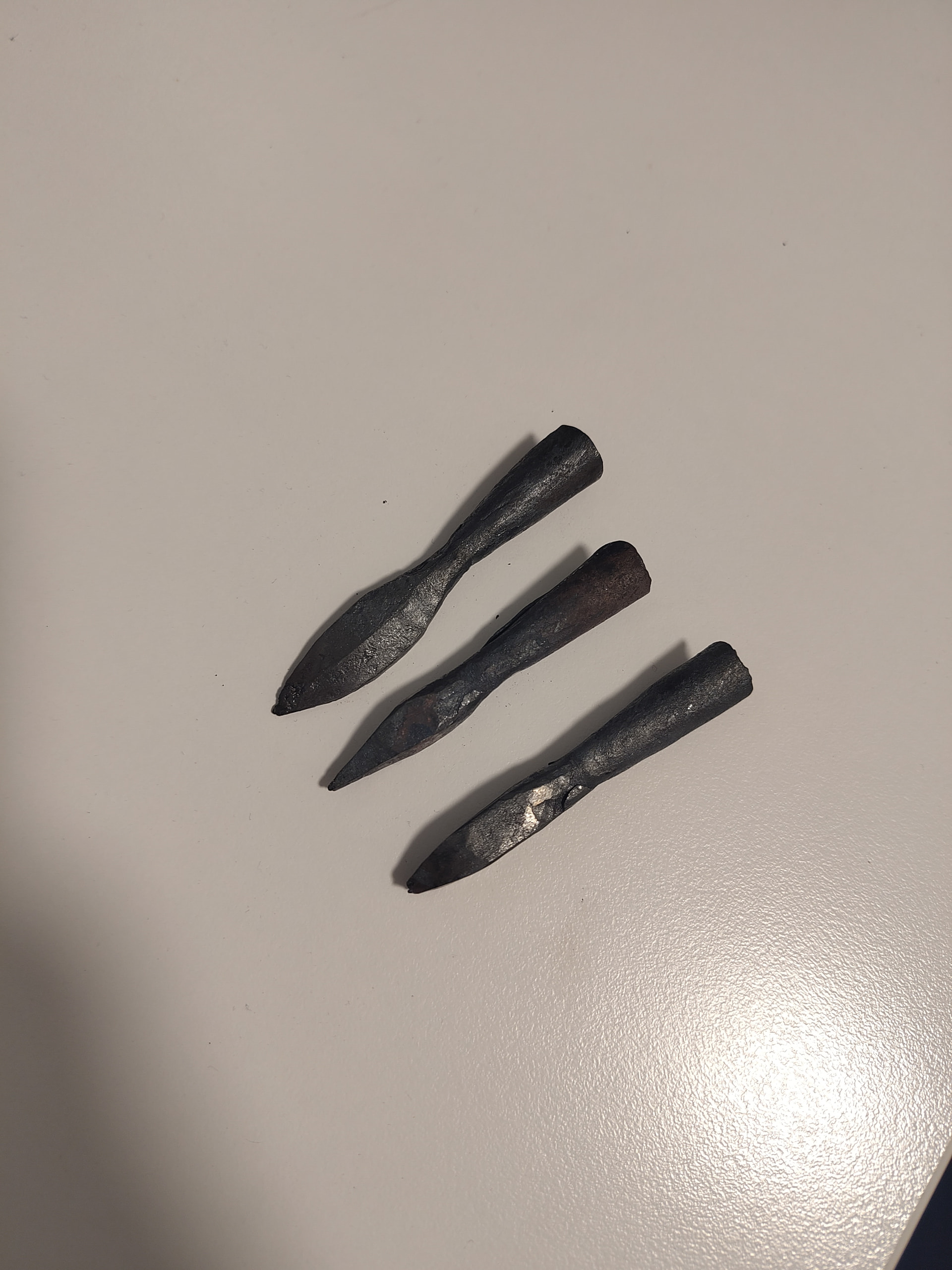 Tein nuolenkärkiä kansalaisopiston taontakurssilla. Materiaalina rakenneteräs. Saa nähdä tohtiiko noita ampua vai joutuvatko koriste-esineiksi. Kolme kärkeä kolmeen tuntiin ja vaativat vielä viilalla siistimistä, vaatii harjoitusta jos haluaa päästä tuntipalkoille näillä! Saatan koettaa uudestaankin, ihan hauska ja opettavainen harjoitus aloittelijalle.