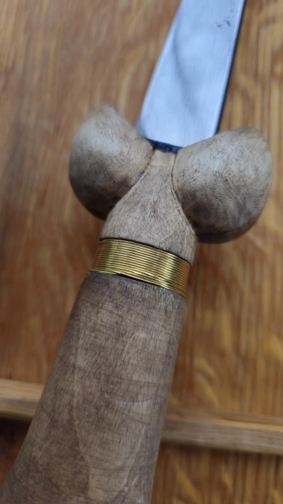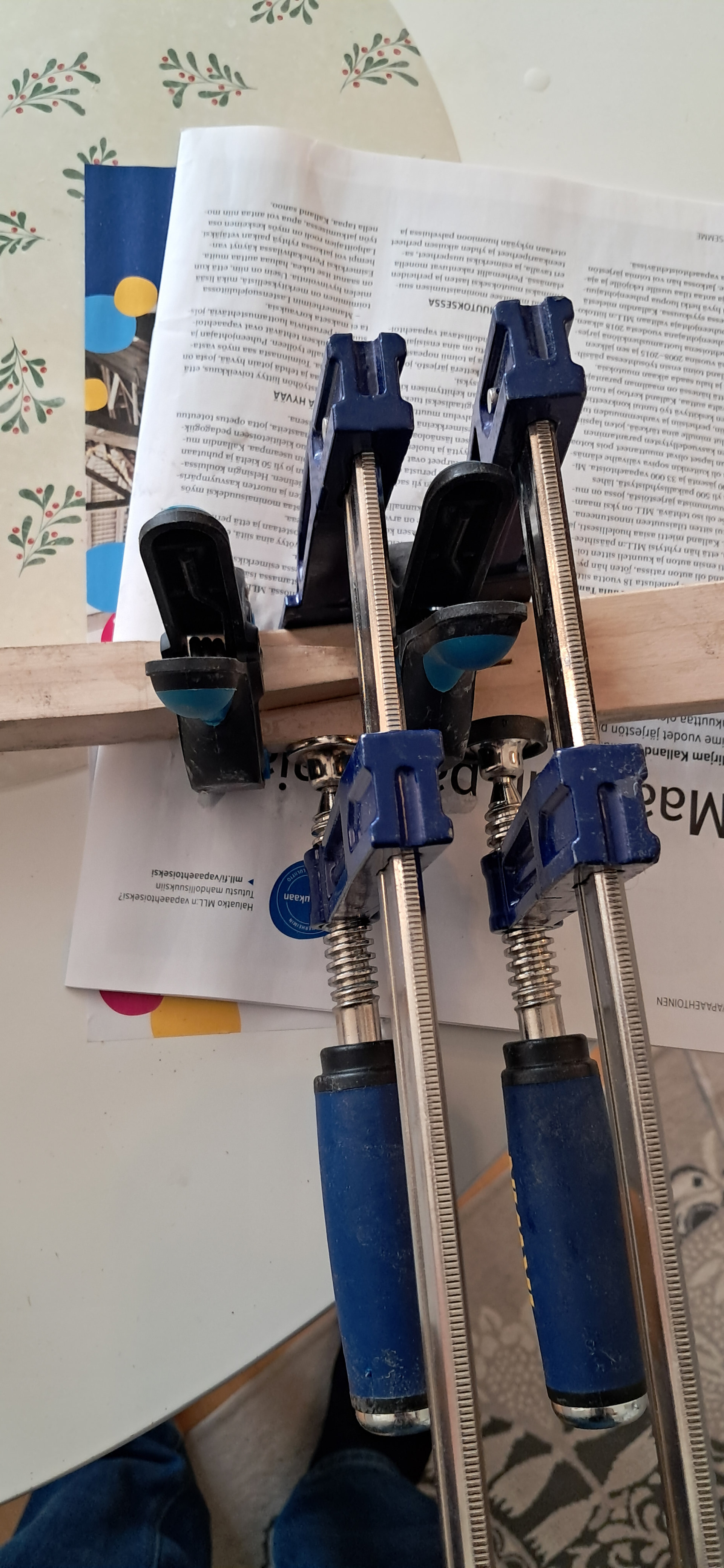 Eihän tuota kahvan V-liitosta edes tarvitse puristaa yhteen. Riittävän tarkka sovitus, pohjustus kaikille pinnoille ja lopuksi paksulla liimalla liimaus yhteen. Tuuppaa vaan liitoksen yhteen ja se on siinä, eikä tosiaan tarvita puristimia.