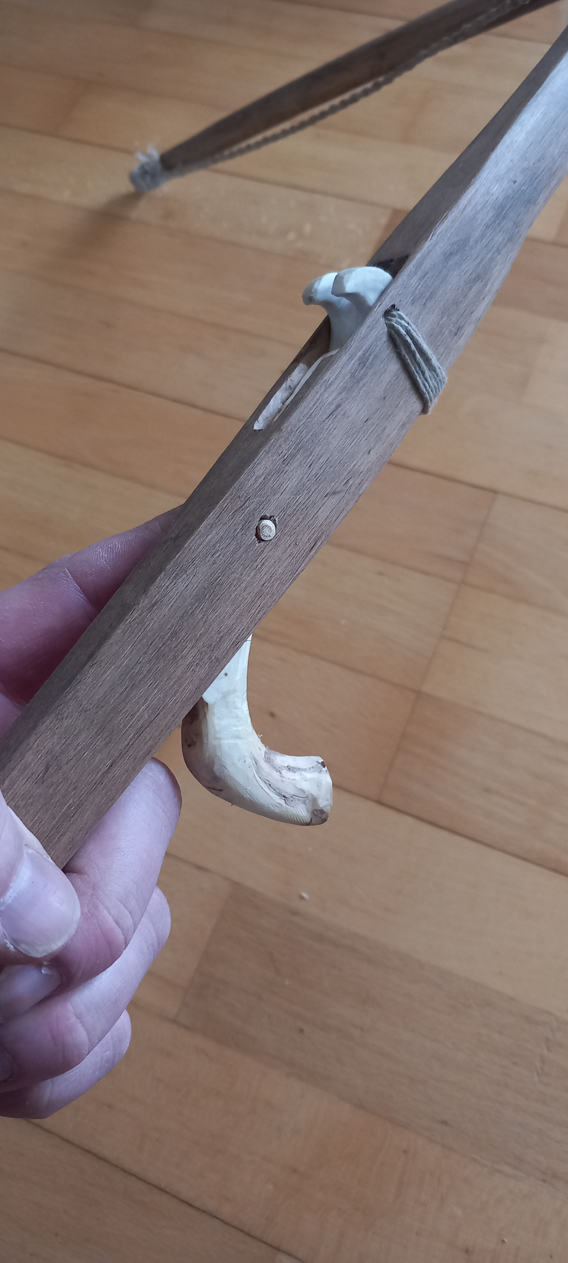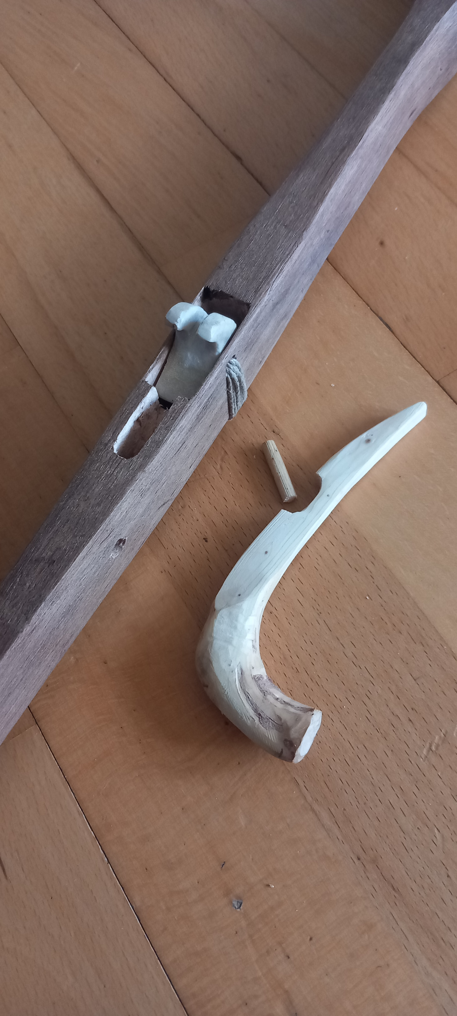 On muuten näin aloittelijana oikeen kunnon nysväämistä toi liitoksen tekeminen. Tässä mun rungossa noi liitokset ei nyt ihan täydellisiä olleet. Tuli muuten tuohon toisen lavan v-liitokseen pitkittäinen 3-4cm halkeama lapaosan runkoon. Mutta tuskin se haittaa kun sarvi tulee kuitenkin alle ja jänteet päälle, niin luulisin sen kestävän. Sen verran tiukka paketti kuitenkin. Voishan sitä jotain poikittaisia jännevahvistuksia tehdä siihen kohtaan. Tietty jotku mestarithan sahaa noita v-liitoksen pohjia ihan tarkotuksella.