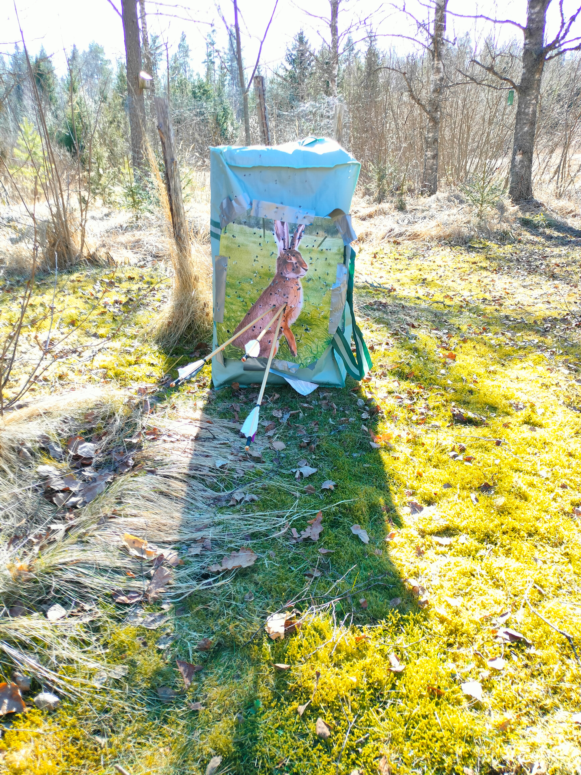 Kannettava maalitaulu. Materiaalikustannus 5,99 EUR (Clas Ohlson kestokassi iso). Täytetään pakkausmuovilla jota duunista saa niin paljon kuin jaksaa ottaa, puristetaan pelleteiksi ja kieputetaan elmukelmua ympärille semmoisiksi huumekönttien näköisiksi. Pysäyttää 40-50 -paunaisilla ammutut nuolet vähintään yhtä hyvin kuin solumuovihässäkät. Paino noin 10 kg eli heikompi hessukin kuskaa vaikka kyöpelinvuoren huipulle.