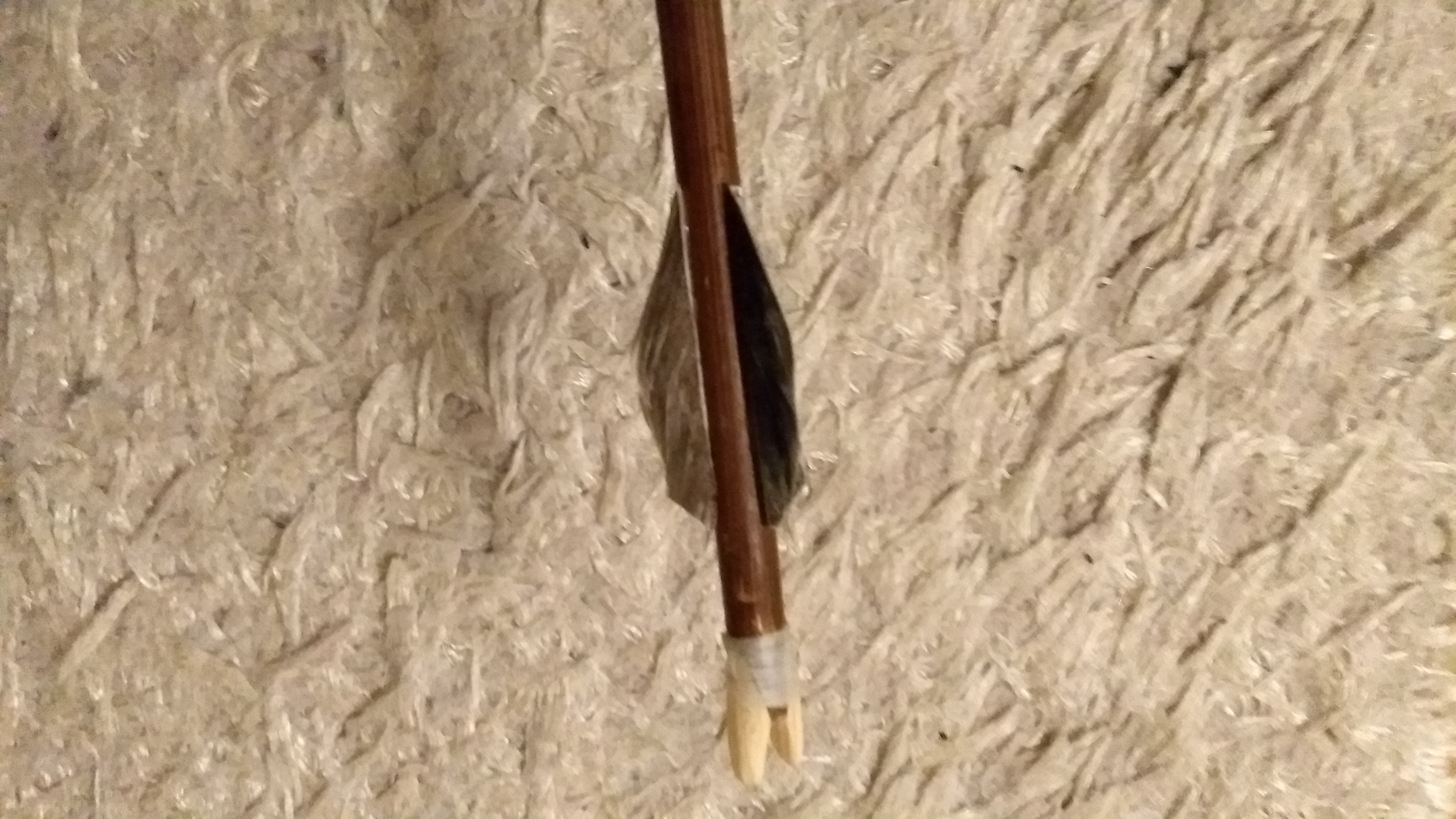 Kävin koeampumassa bambunuolet. Ihan hyvin lensivät. Tänään Ruskeasuolla pienessä tihkusateessa oli vain puunuoliampujia, kolme puujousta ja kaksi modernia mongolia ja yksi moderni hunni. Unkarilaisella ampunut kyseli vinkkejä jousentekoon joita tietty mielelläni annoin. Hienon luisen peukalorenkaan oli kaveri tehnyt.