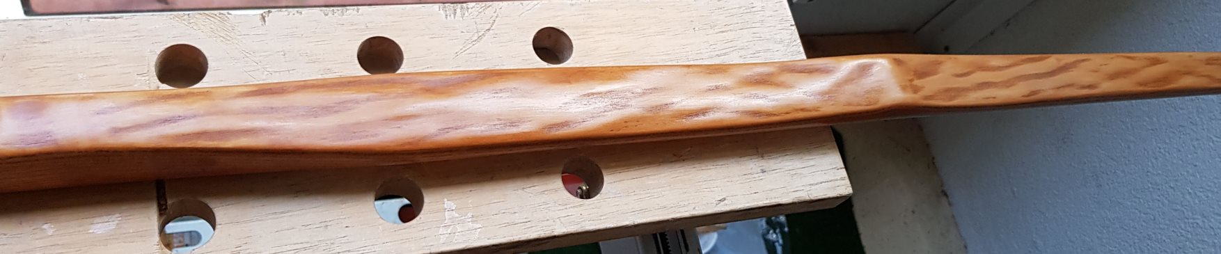 Todella kaunis pinta! Tuo on juuri se, mitä ei lankkujousiin ikinä saa. Jos puun kuorii tuoreeltaan, niin siihen jää usein tuollainen hyvin kaunis uurteinen pinta. Kuivunutta aihiota kun kuorii, niin siitä ei tule ihan yhtä hienoa.
