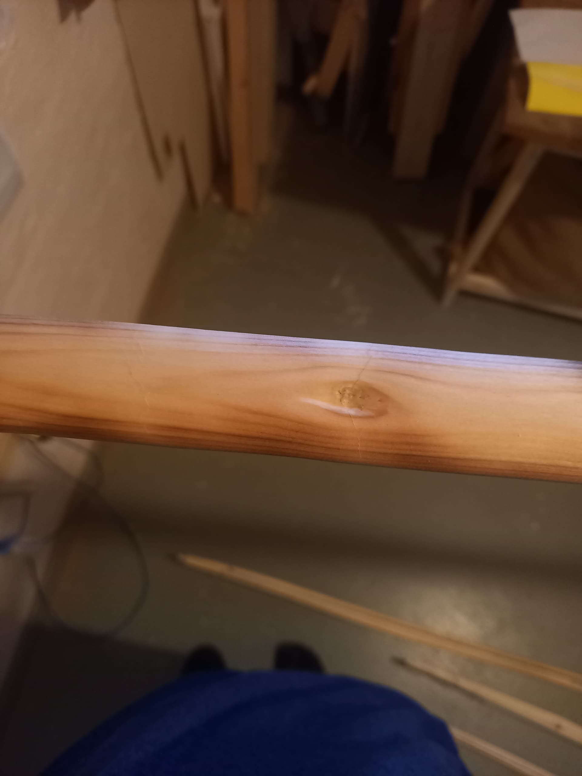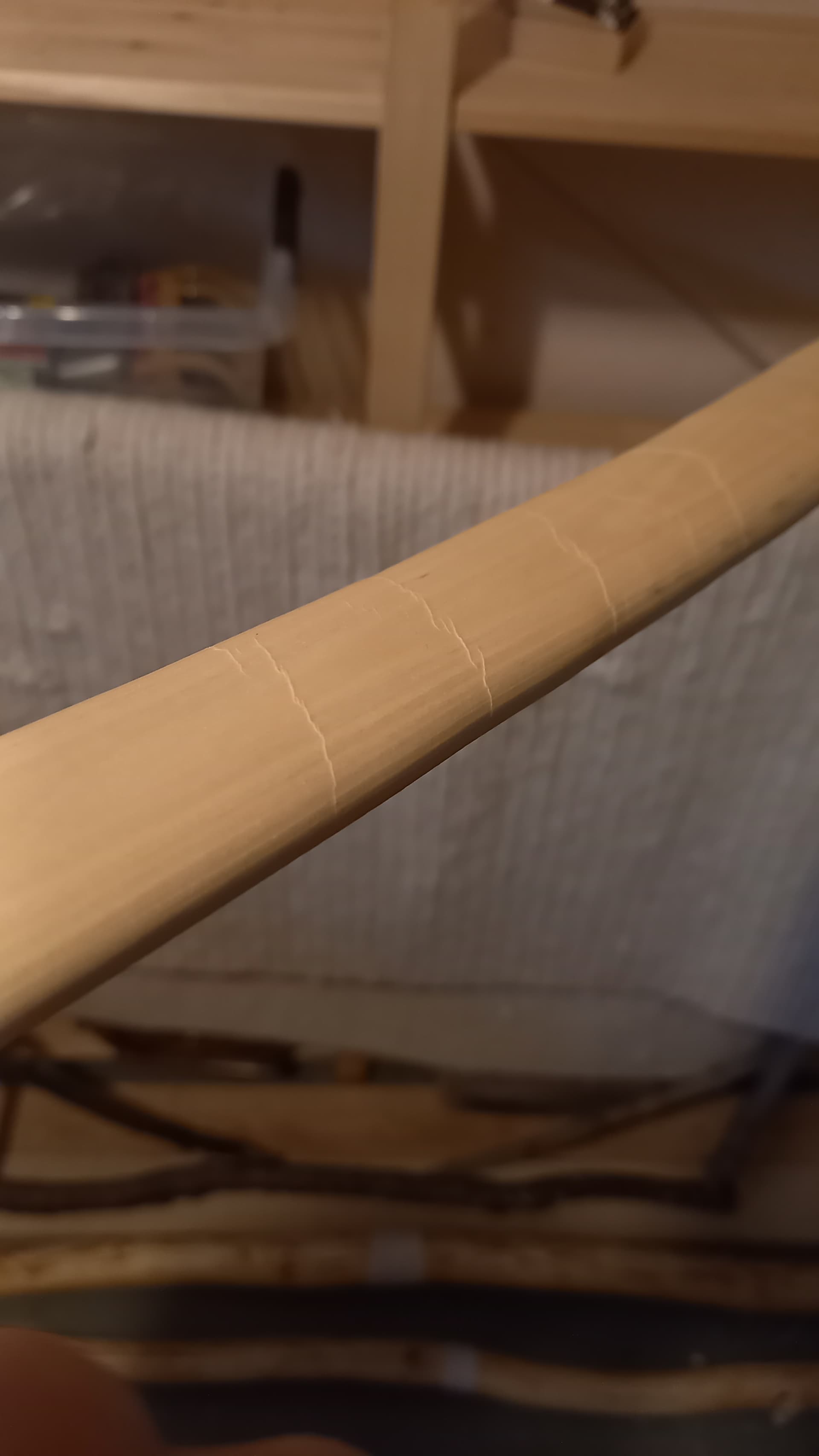 Runkoa halkaistessa yhteen aihioon tuli aika suuri säle vatsaan, siitä kuva. Puolitetun rungon edelleen puolittaminen on aika haastavaa, lähtee herkästi viistoon ja turmelee toisen puolen. Tuo säle saattaa poistua ohentamisvaiheessa, ehkä ei jos koitan tehdä jäykän jousen. Auttaisiko säleeseen liima? Minkä tyyppinen liima? En oo viel ehtiny opiskella kirjoista jousen tekoa.