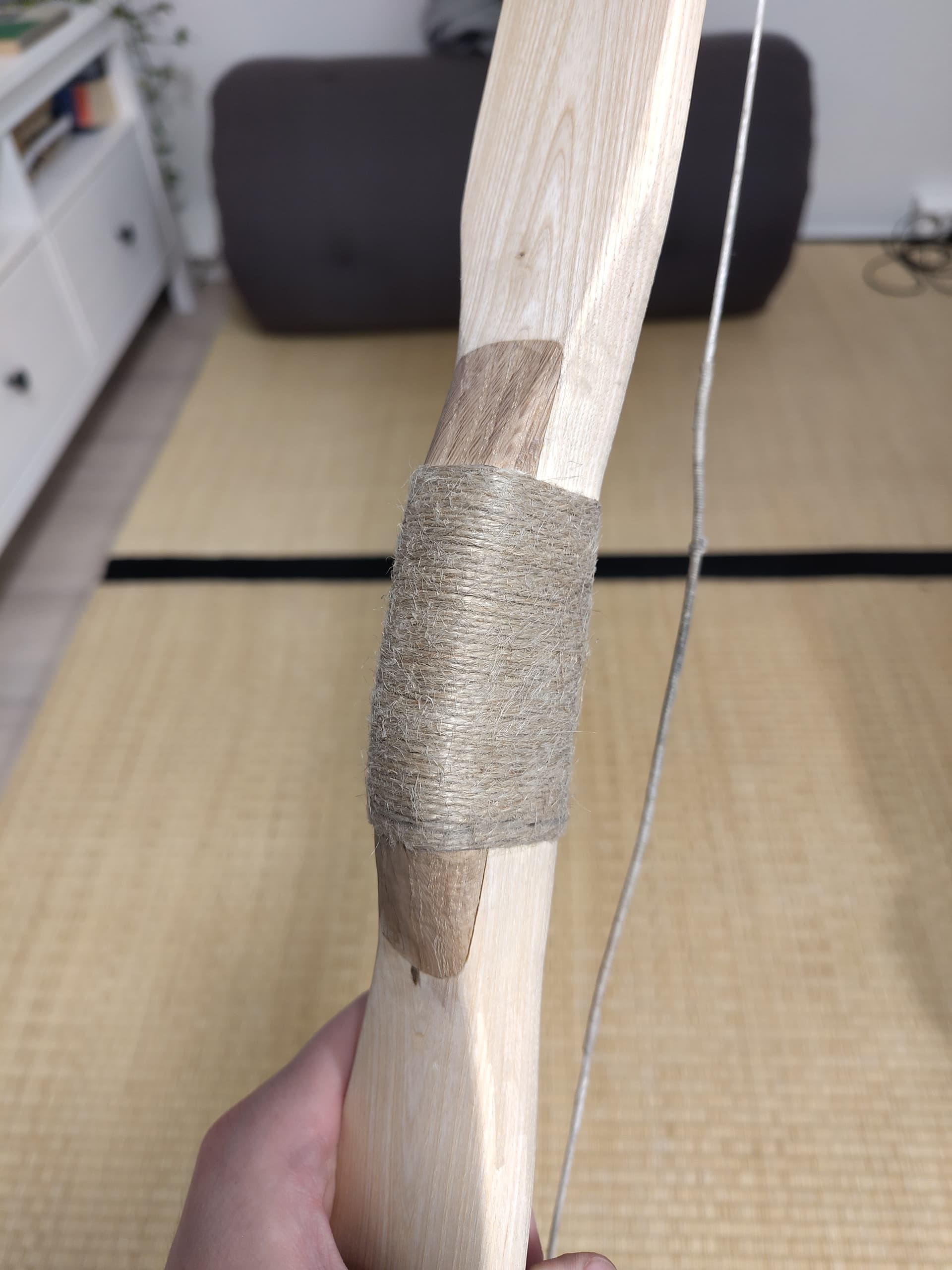 Halusin jouseen jäykän kahvan, mutta en ollut varma riittääkö aihion paksuus. Liimasin kahvaan pienen palikan tammea vahvikkeeksi, ja tein kahvan muotoilun jälkeen sen päälle punoksen varmistukseksi: