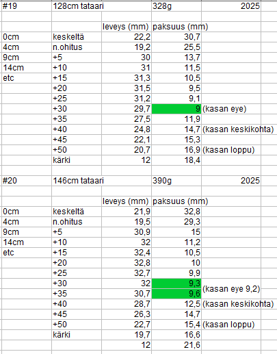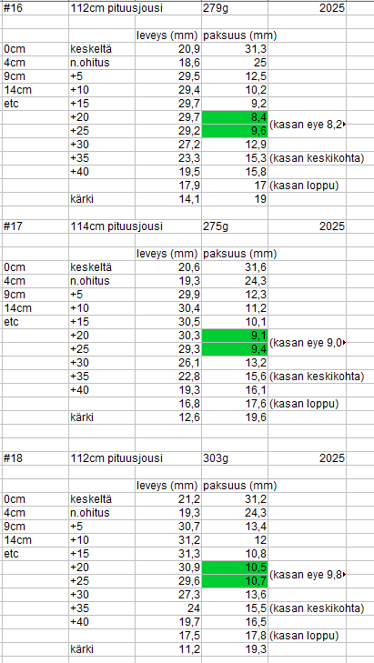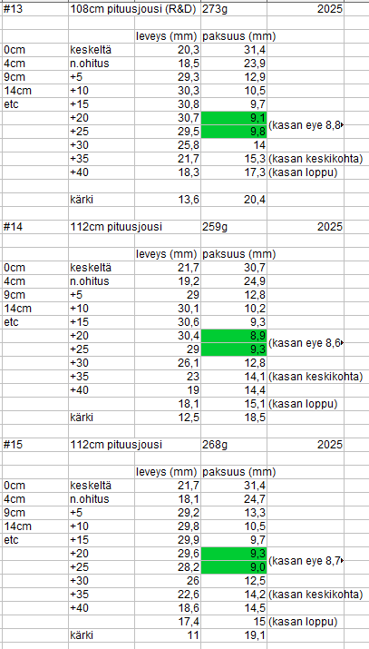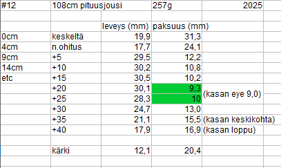 - Jo 11mm paksu lapa (ohuimmasta kohdasta) tekee 114cm jousesta 80# vedoltaan