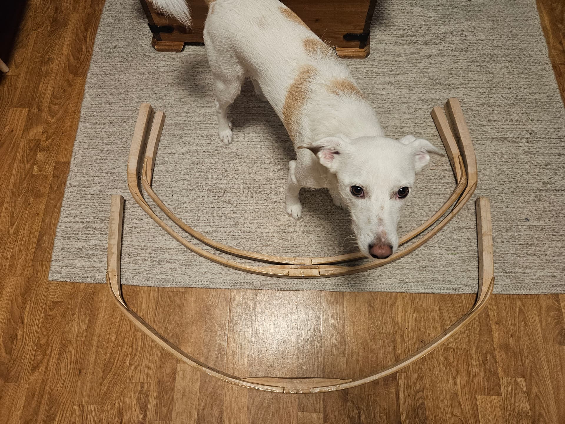 Koira mittakaavana ei toimi, koska jouset on oikeasti valtavia. Lyhyin on ~170cm ntn, loput 180cm ntn. Ja sitten on tuo yksi jousi tuolla ylempänä, eli 4 manchujousta tulossa.