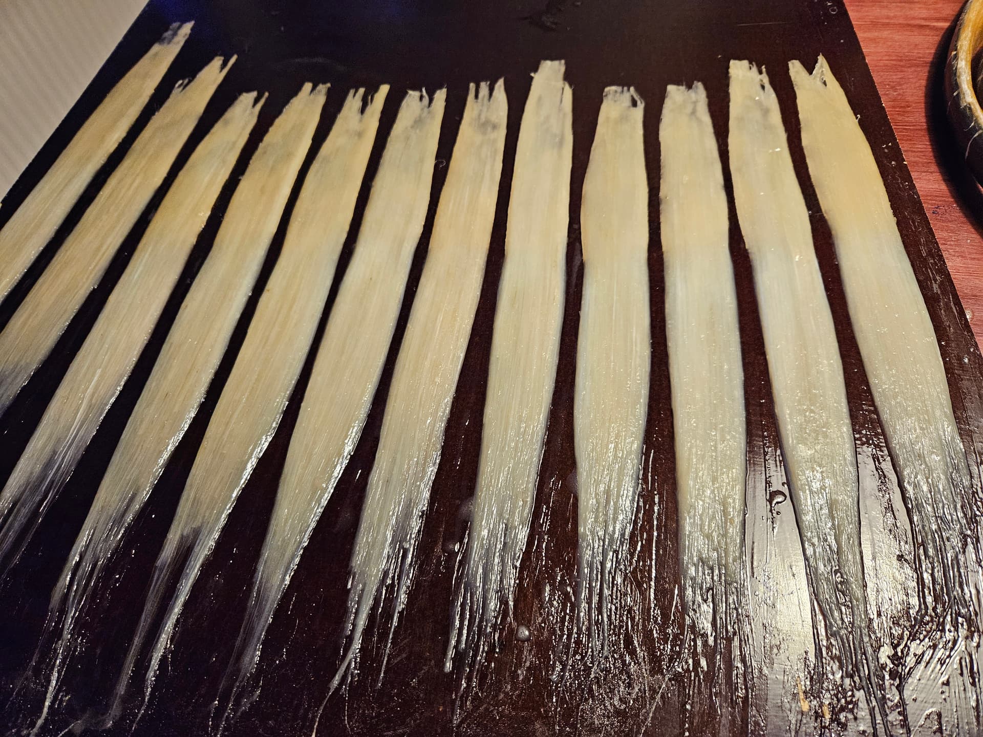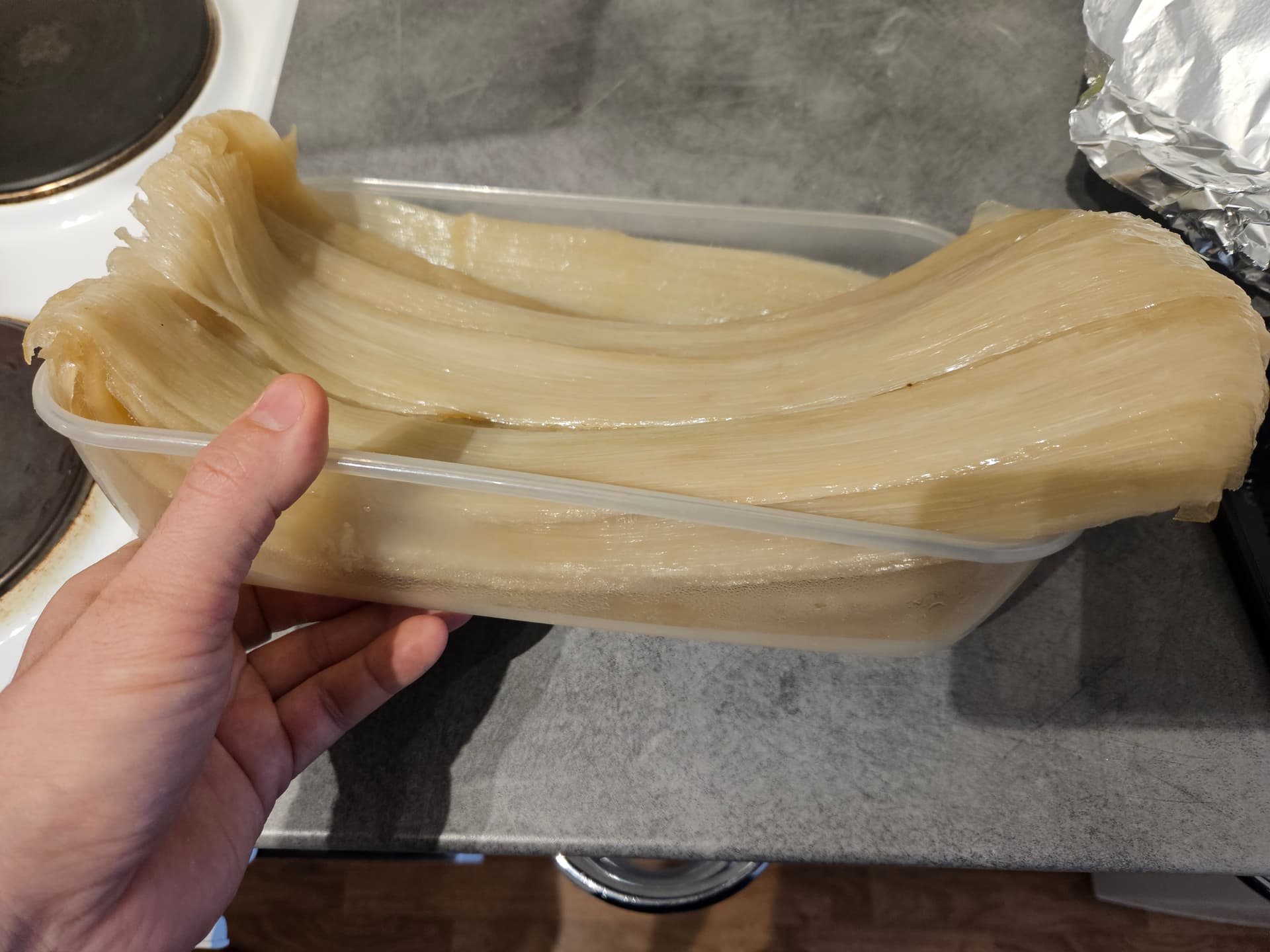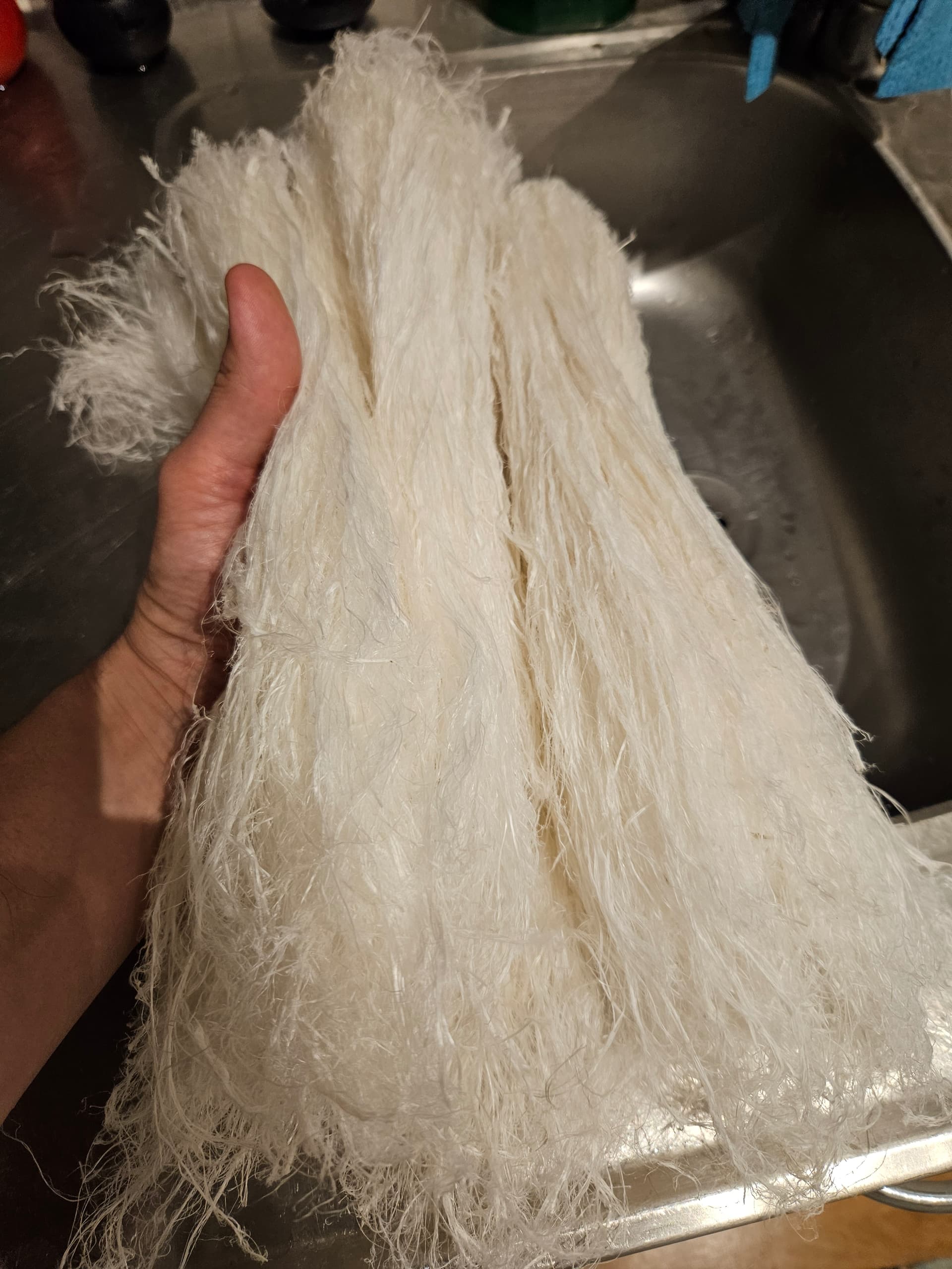 Työlästä on jännetyöt… 4h meni jänteiden loppukäsittelyyn, pesuun ja niputtamiseen. Sitten 8h esiliimaamiseen ja geeliyttämiseen. Lopuksi 5h selystämiseen.