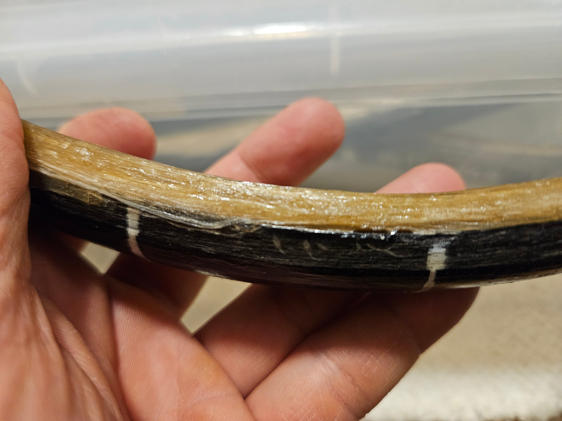 Sama juttu kun puun kanssa, sarven pinta hapettuu. Ja sarvessa se on aika kriittistä kun liimapinta on haastava tehdä.