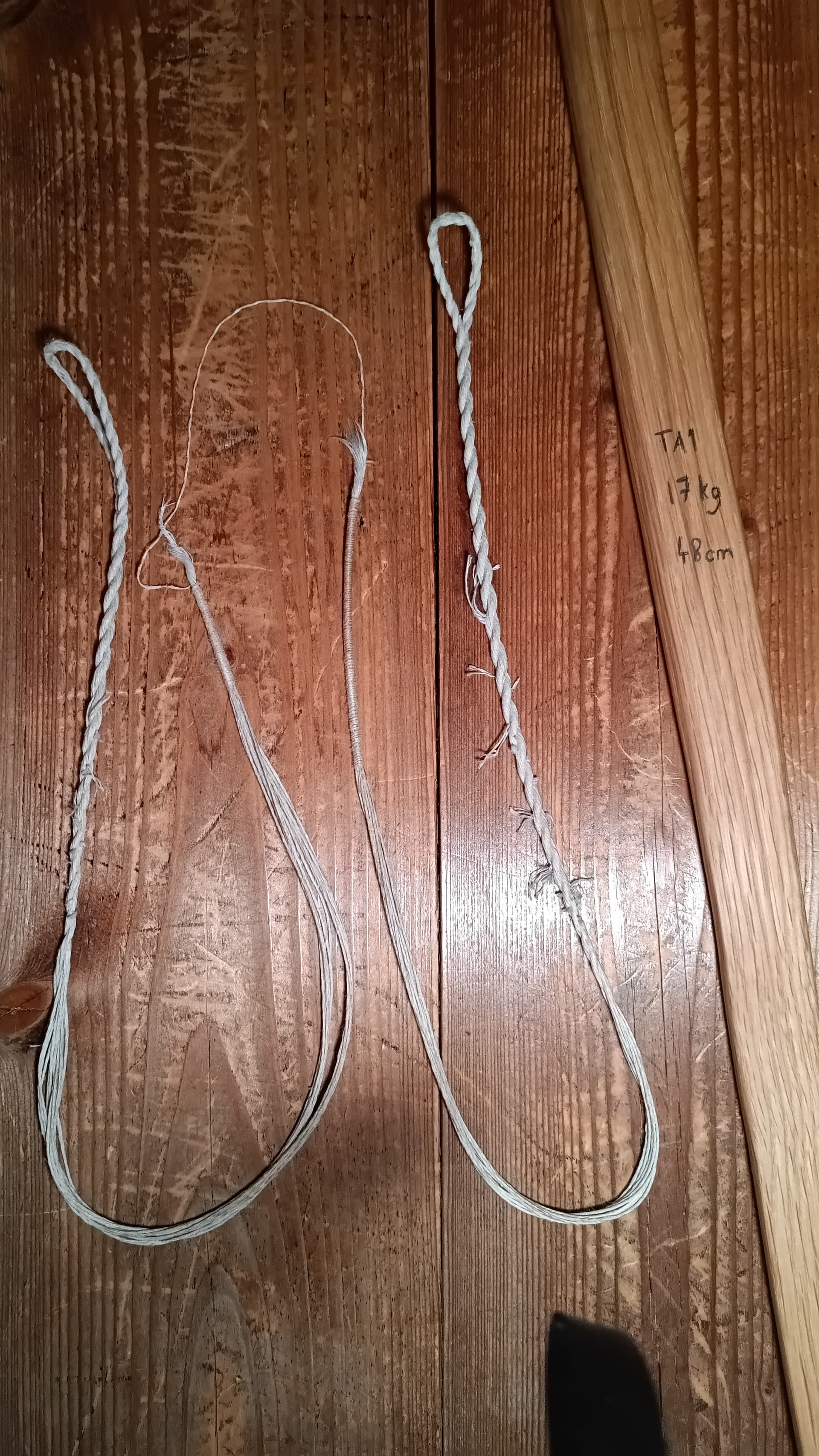 Ensimmäinen jousen jänne joka mennyt katki. Vain pari-kolmesataa kertaa ammuttu. 2x6 säikeinen pellavajänne, paksuus 2,6 mm ilman punosta. Pellavalangan merkkiä en nyt muista, kolmisäikeinen. Tein kolmella 50 cm langalla vetotestit, 5-6 kg katkesi kukin.
