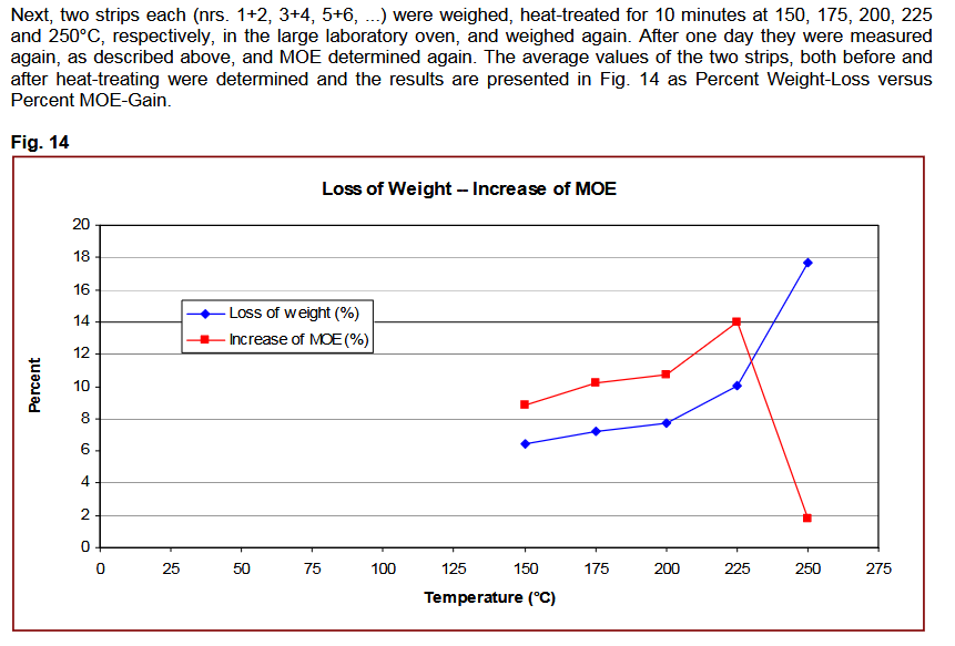 Paahtaminen on niin optimaalinen että massa putoaa 10% ja kun vertaa artikkeliin (Wolfram Schott), 10% massapudotus lupaa 14% MOE nousua. Eli paras mahdollinen.