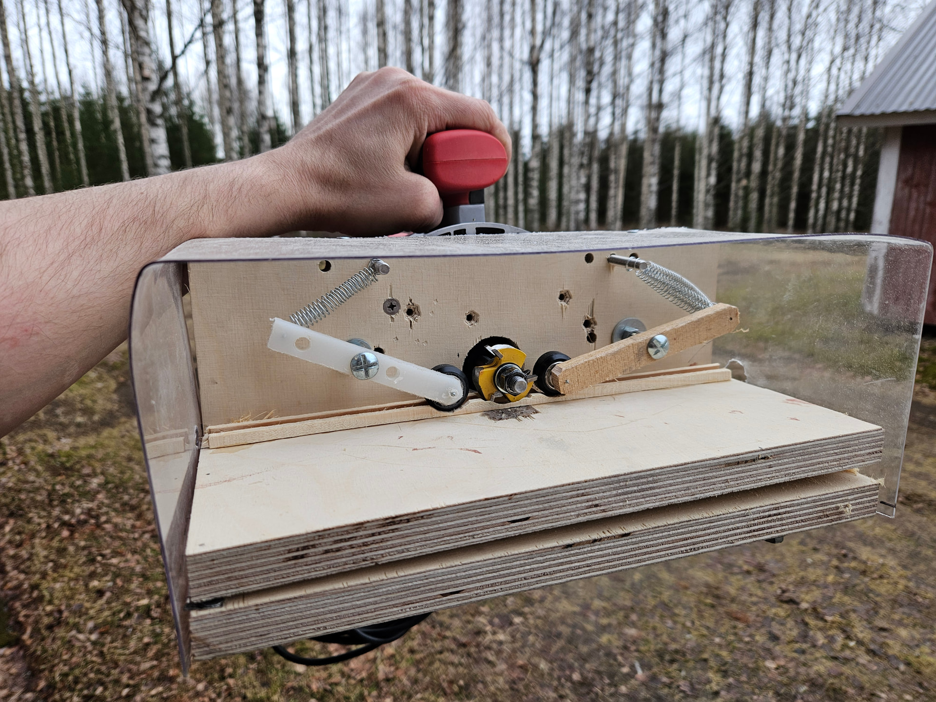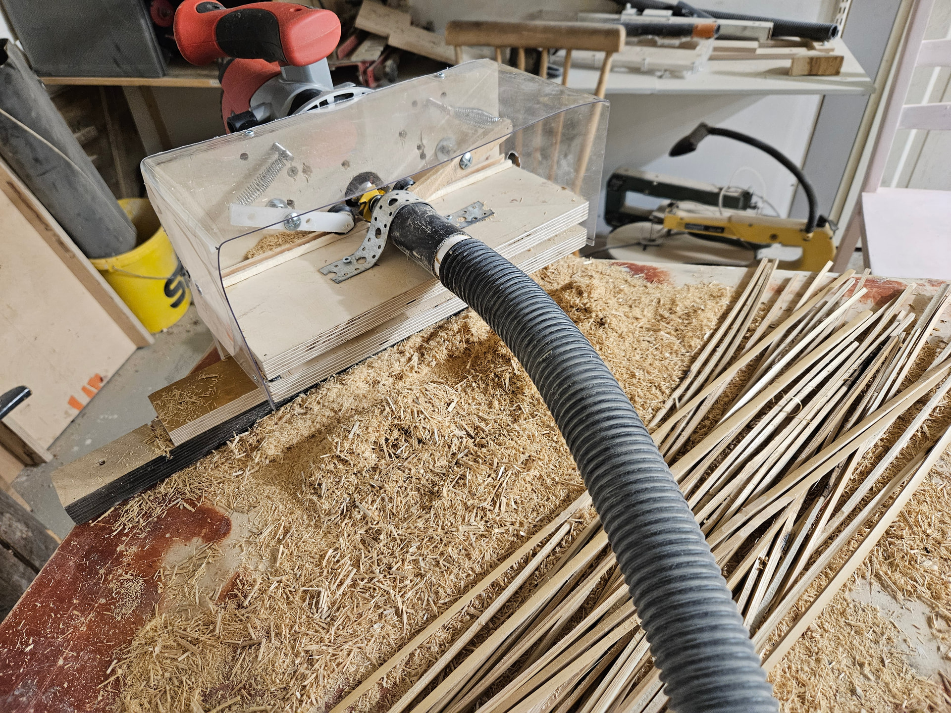 Kehitys kehittyy. Tällä jyrsinjigillä tekee turbovauhdilla lohkonuolia. On aika raju peli noin hentojen säleiden työstämiseen mutta sujuu nopeaan ja laatu on tasaista! Kärki pitää terottaa ettei terä haukkaa rajusti ja riko sälettä. Tämän jälkeen tarvitsee enää säleet paahtaa ja höylätä barrelimuotoon. Sitten liimaus.