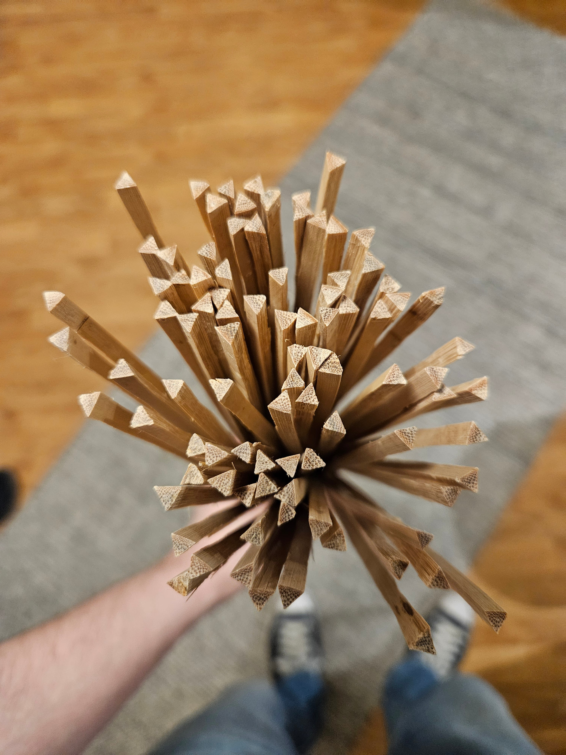 Tajusimpa muuten sen äskettäin että säleet kannattaa höylätä valmiiksi ennen paahtamista. Bambu on paljon kovempaa paahtamisen jälkeen ja höylääminen vaikeampaa… Tunti itsensä vähän tyhmäksi kun on jokusen 80+ nuolta hinkannut teräksenkovalla paahdetulla tonkinilla!!!