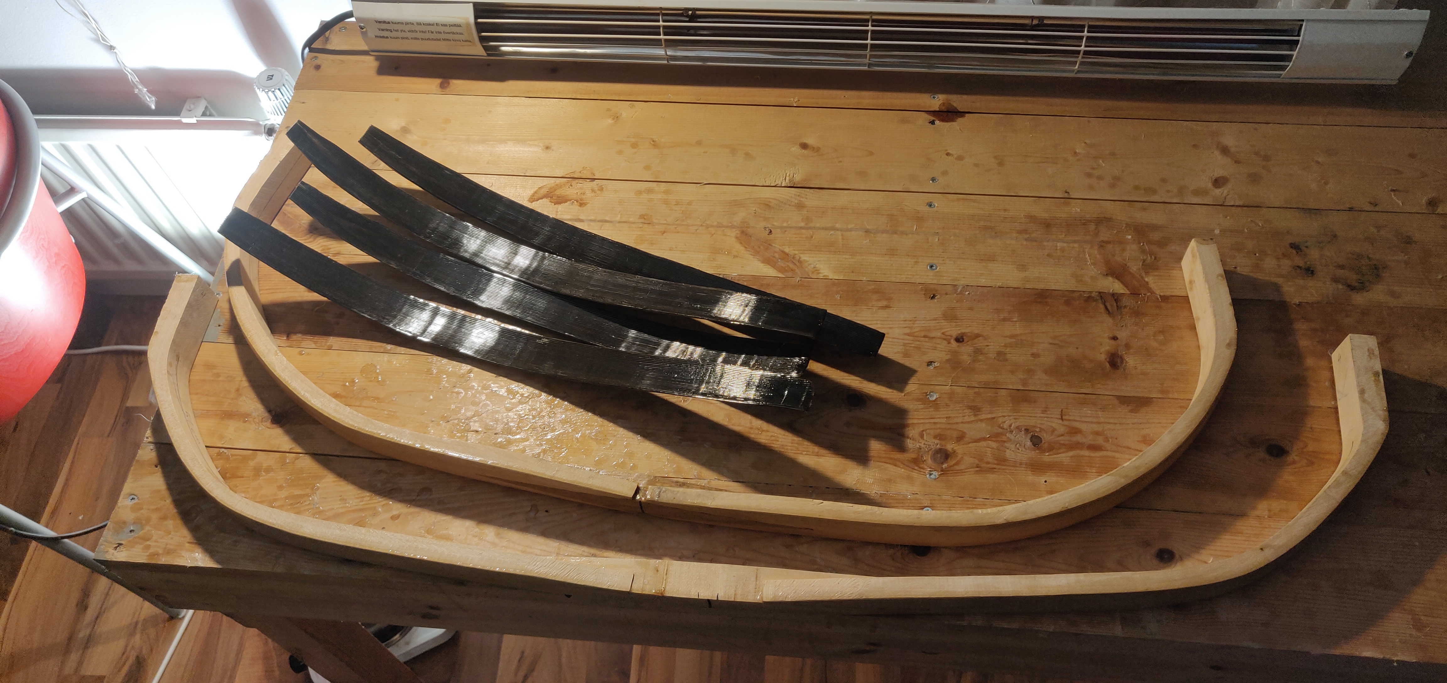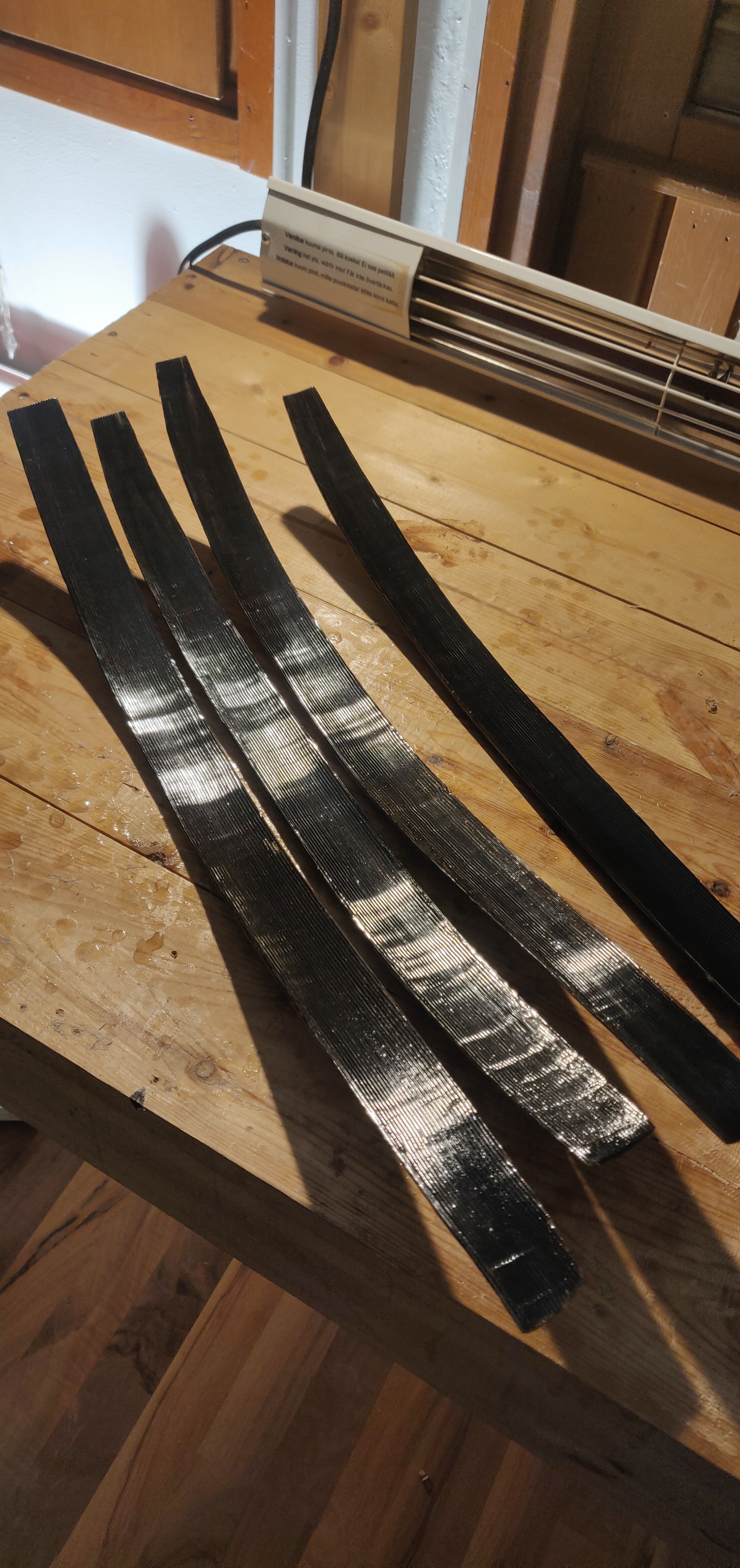 Corepaksuudet jää taipuvissa osissa 11mm -> 9mm (kasan eye). Eli leveydestä riippuen ja 2-3mm jännekakku lisättynä pitäisi olla 70-90 paunaisia jousia kuivamassa. Saa noista sitten kevyempiä jos ei tuota tahdo.