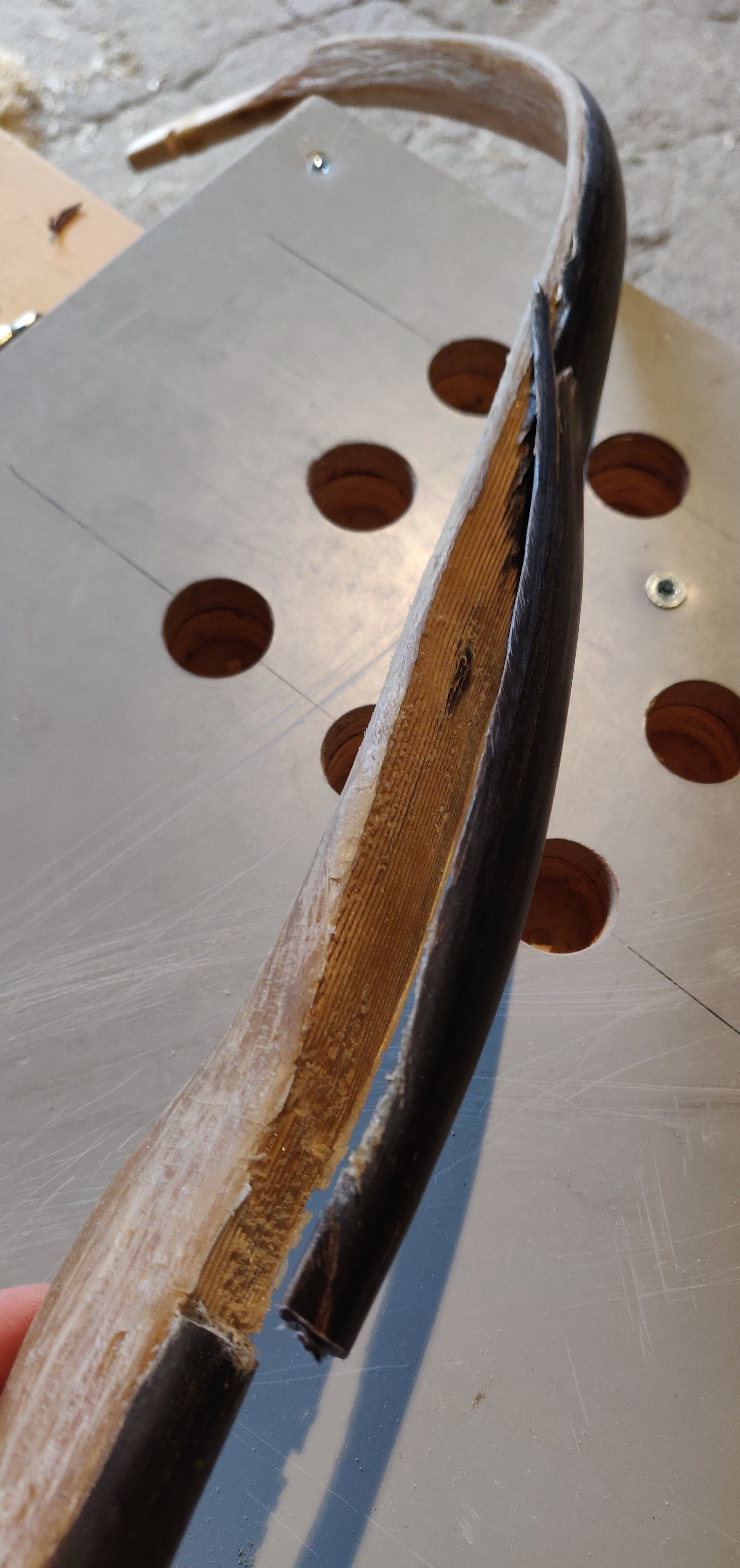Sinänsä kiinnostavaa, että kolme alkujaan huolellisesti tehtyä jousta hajoaa mutta niihin lätkitään uudet vatsat ja tuloksena toimivat jouset. Koko homman juju lieni siis sarvivatsan liimaus, erityisesi sarven pohjustus riittävän ohuella ja kuumalla liimalla? Sekä köysipuristimen käyttö?