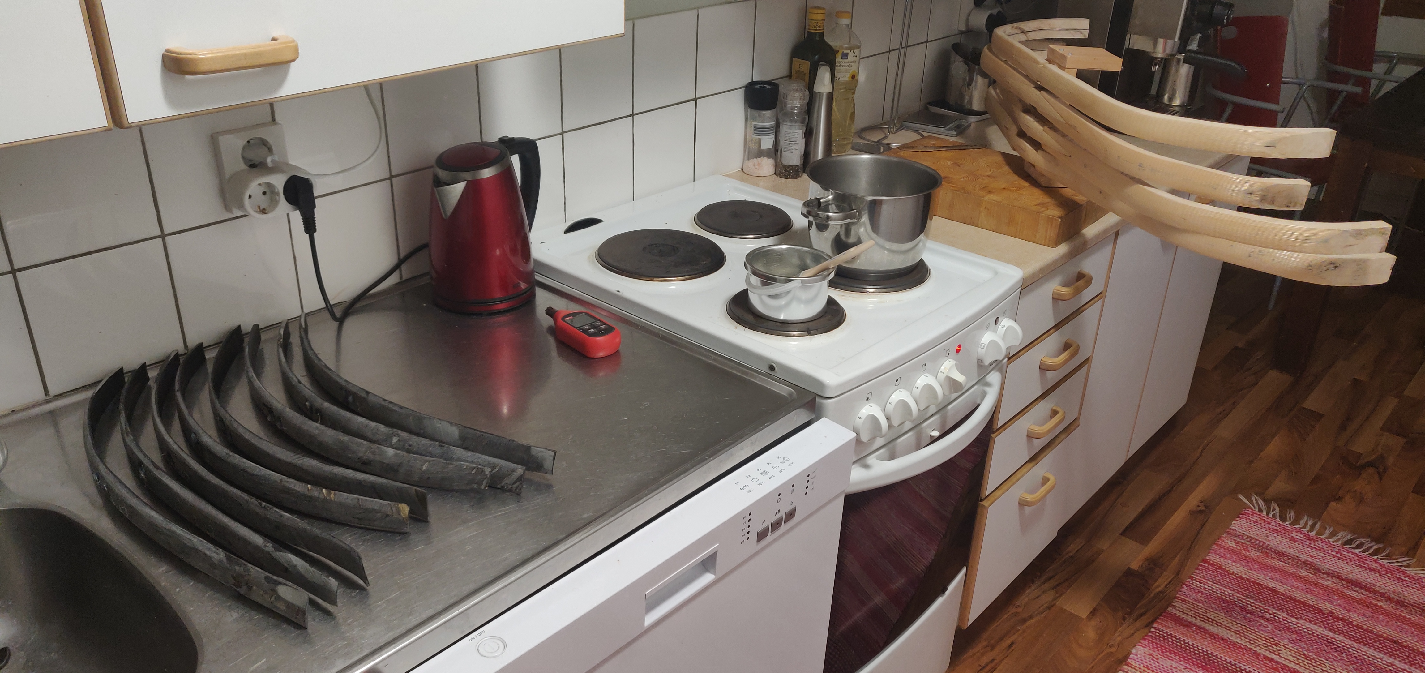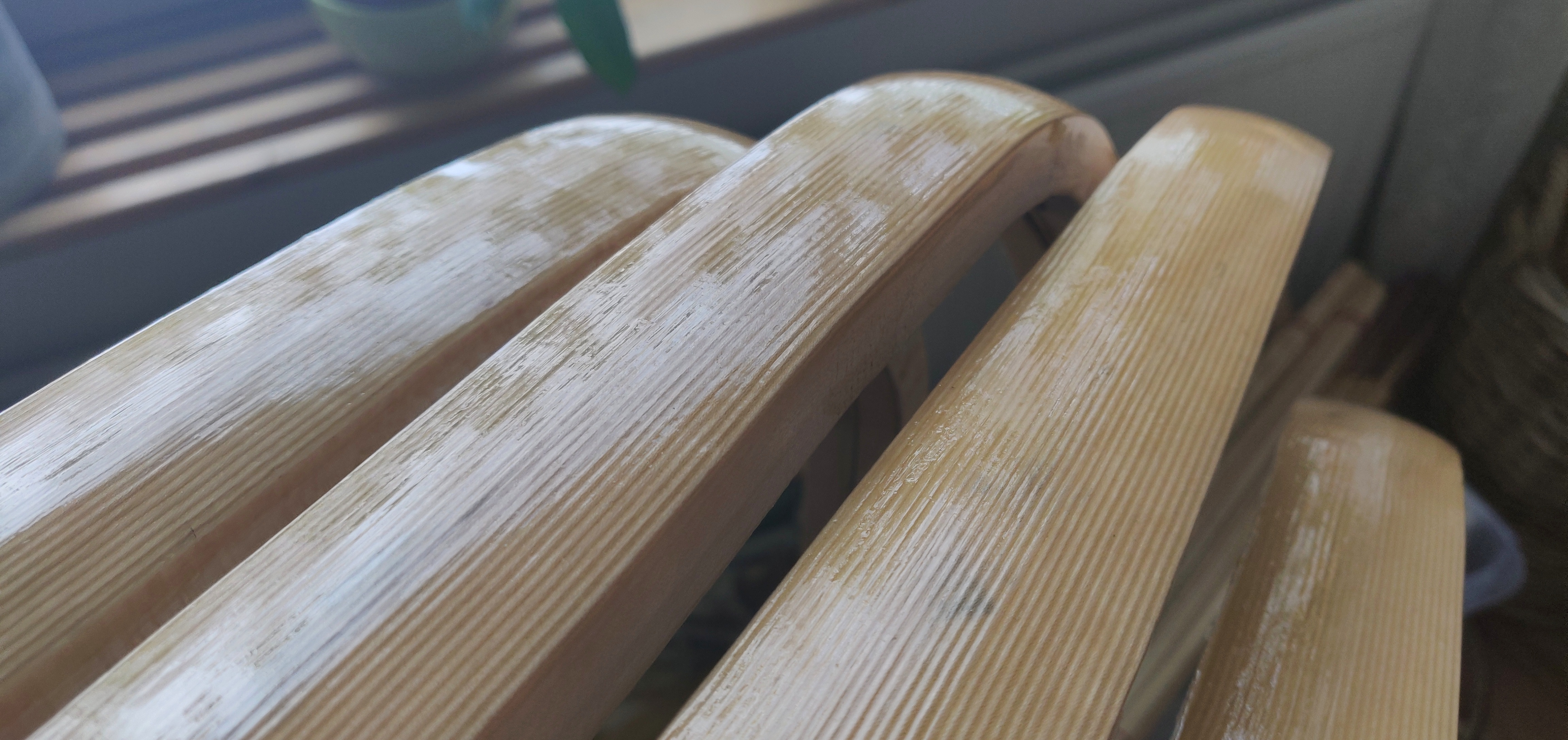 Ja, olisiko olennaista sittenkin hyvin ohuet kerrokset ja hyvä kuivaus (vuorokausi, pari, enemmänkin?) välissä, jotta liima ehtii kuivumaan ja asettumaan?