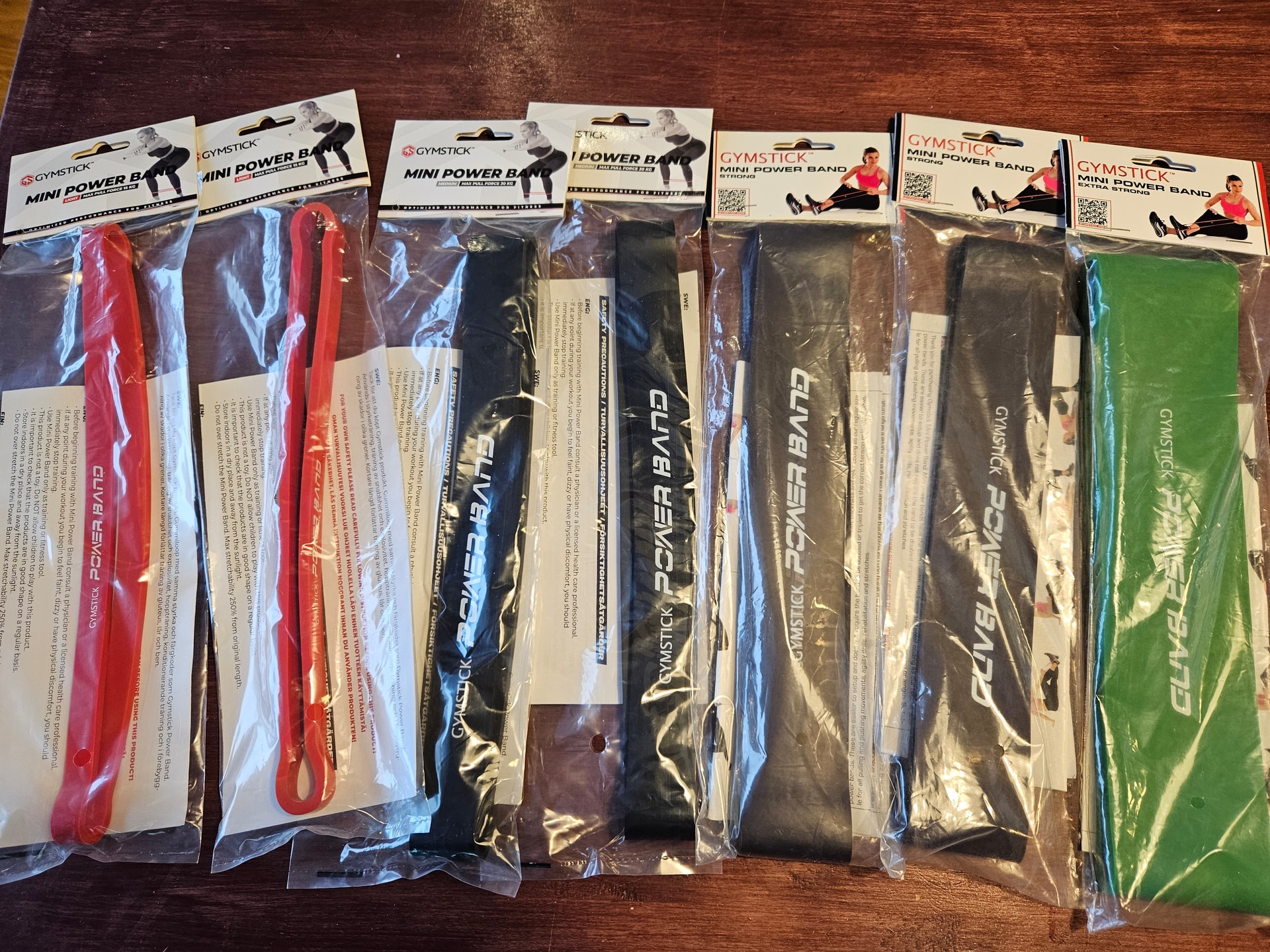 Kävin Tampereen kuntokaupassa katsomassa kuminauhoja. Ensivenytyksellä kaupassa nämä 30cm nauhat tuntui jäykiltä. Noh, nyt otin puntarilla jäykkyyden tuosta isoimmasta vihreästä pannasta niin vain 80# näytti… Taidanpä säästää vain kaksi jäykintä ja palauttaa loput.