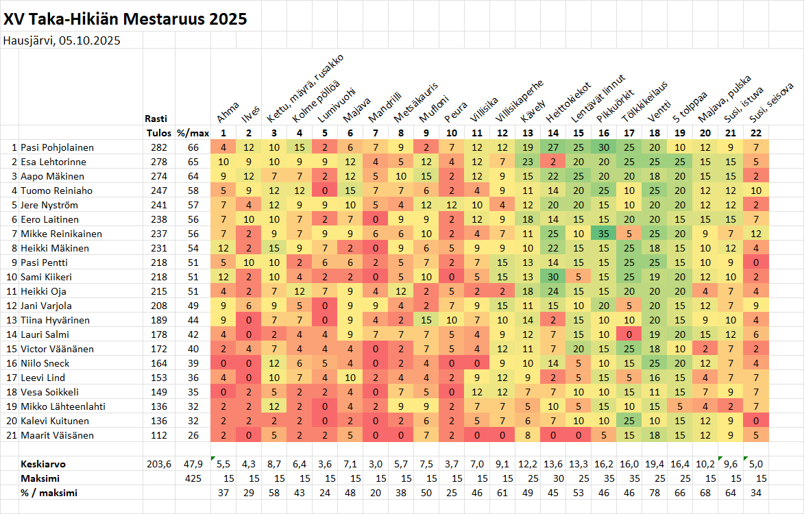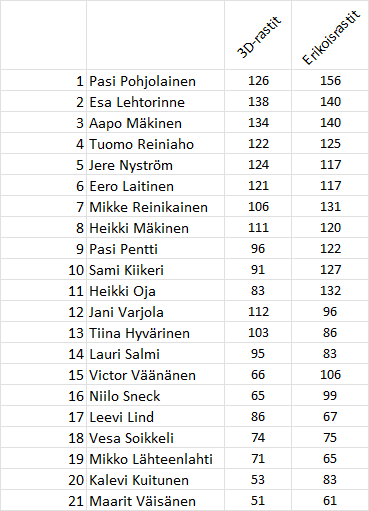 Tässä vielä tällainen erittely pisteistä, 3D-rastit ja erikoisrastit. Mielenkiintoista on, että Aapo päihitti 3D-rasteilla Pasin! Se on kova suoritus! Pasilla oli taas selvästi paras tulos erikoisrasteilla huolimatta siitä, että tolpat olivat ilmeisesti vähän hankalia.